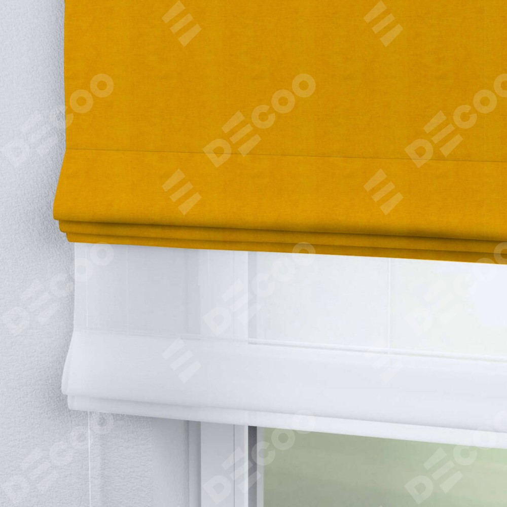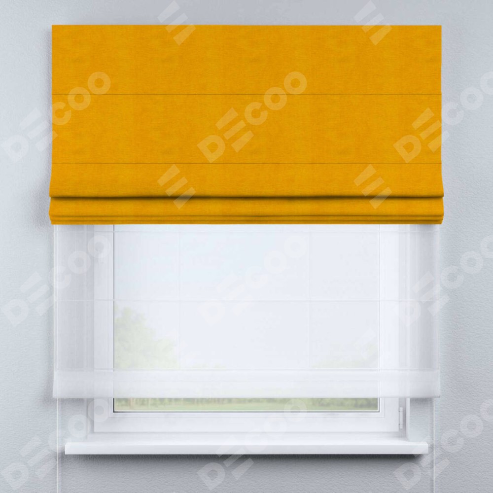 Римская штора день-ночь производителя «Cortin», используется для проёма, пошита из двух полотен, с лицевой стороны вельвет желтый артикул 85547, вторая ткань тюль (по стандарту комплектуется тюль белого цвета артикул V-01). Имеет универсальный механизм и подходит для монтажа: на потолок, на стену и в нишу.