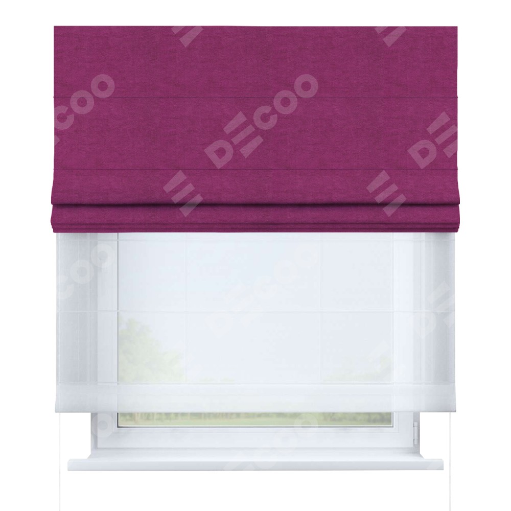 Римская штора день-ночь производителя «Cortin», используется для проёма, пошита из двух полотен, с лицевой стороны вельвет фиолетовый артикул 85552, вторая ткань тюль (по стандарту комплектуется тюль белого цвета артикул V-01). Имеет универсальный механизм и подходит для монтажа: на потолок, на стену и в нишу.