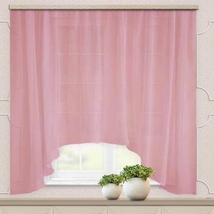 Штора для кухни входит в число самых популярных моделей занавесок благодаря простому и сдержанному стилю. Изделие изготавливают в форме арки: края располагаются ниже середины. Ширина — 285 см, высота — 160 см, высота взъёма — 52 см.