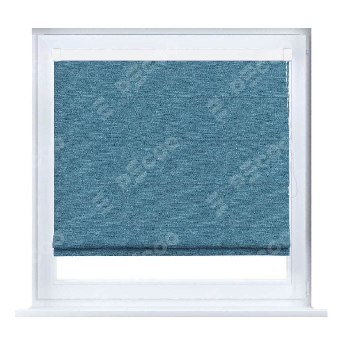 Римская штора кассетного типа, производителя «Cortin», устанавливается только на пластиковые окна и прилегает к стеклопакету, пошита из ткани лён голубой, артикул 63741.