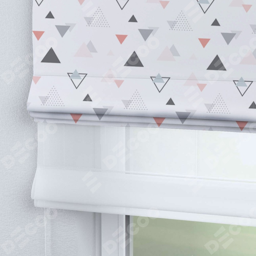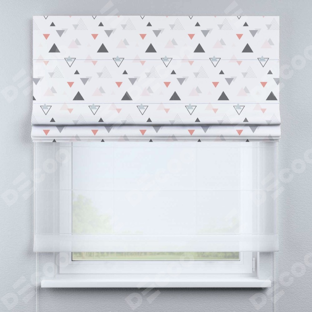 Римская штора день-ночь производителя «Cortin», используется для проёма, пошита из двух полотен, с лицевой блэкаут с нанесением сублимационной печати «Дождь из треугольников», вторая ткань тюль (по стандарту комплектуется тюль белого цвета артикул V-01). Имеет универсальный механизм и подходит для монтажа: на потолок, на стену и в нишу.