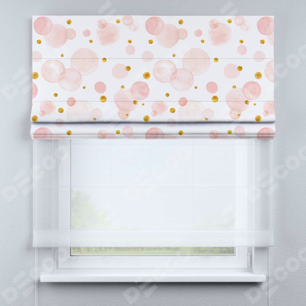 Римская штора день-ночь производителя «Cortin», используется для проёма, пошита из двух полотен, с лицевой блэкаут с нанесением сублимационной печати «Круги и точки», вторая ткань тюль (по стандарту комплектуется тюль белого цвета артикул V-01). Имеет универсальный механизм и подходит для монтажа: на потолок, на стену и в нишу.