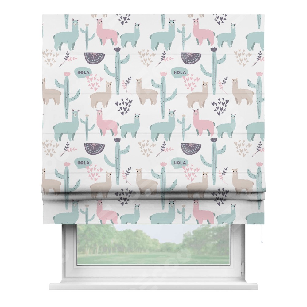 Римская штора производителя «Cortin», используется для проёма, пошита из ткани блэкаут с нанесением сублимационной печати «Милый лама». Имеет универсальный механизм и подходит для монтажа: на потолок, на стену и в нишу.