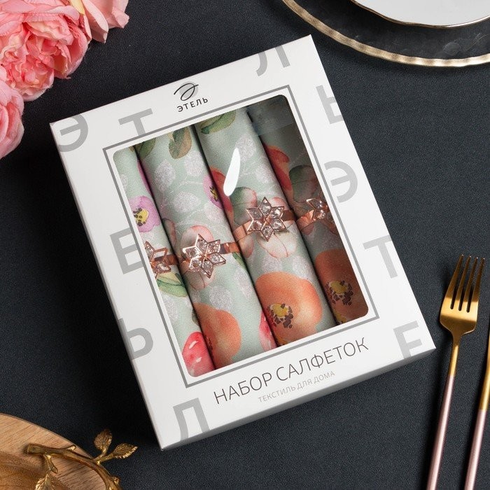 Набор салфеток с декорат. кольцами «Цветочный узор» 46х46см — 4 шт, 100% хл, саржа 190гр/м2