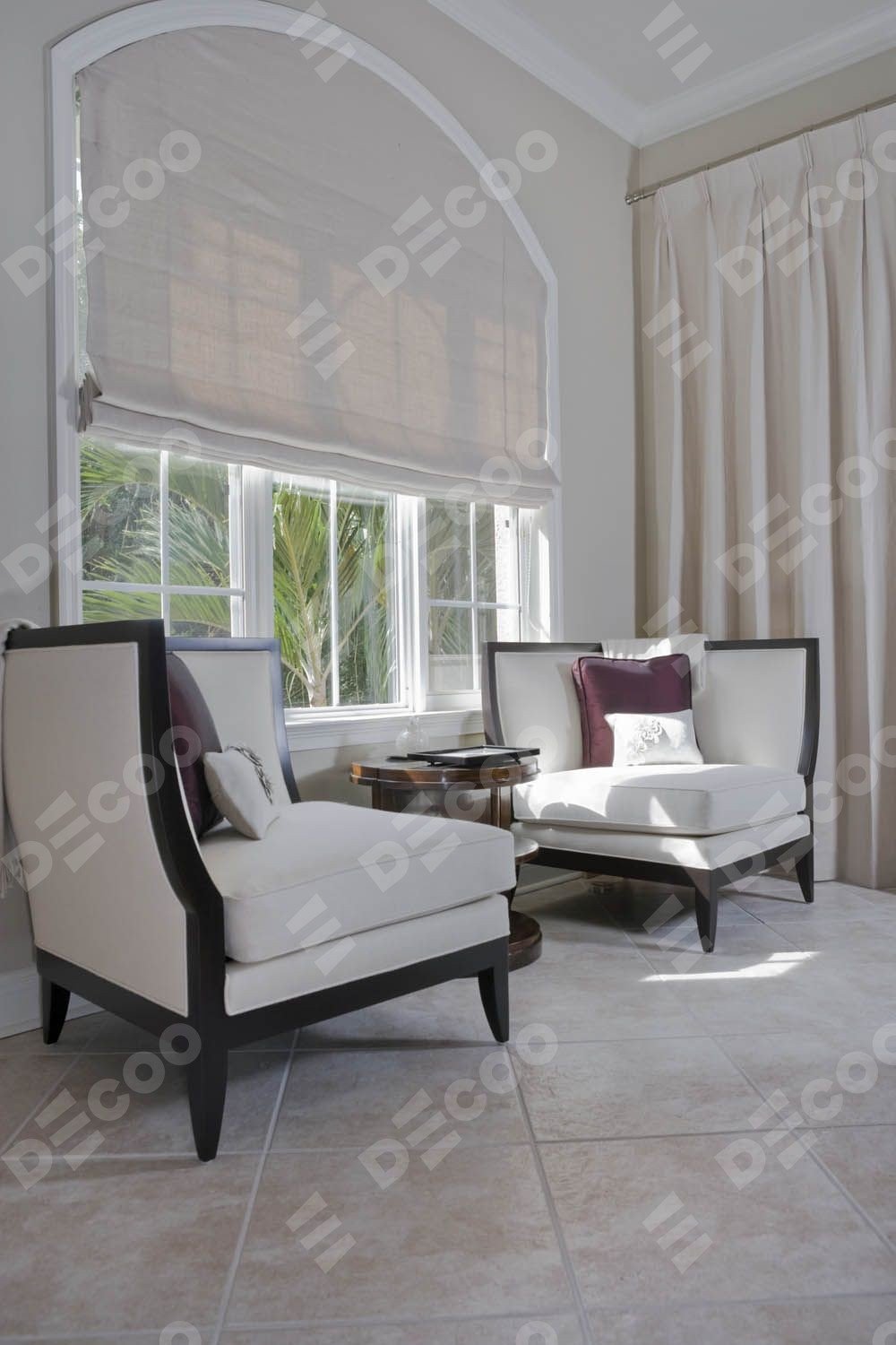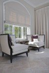 Есть модель римских штор в которой первый слой из плотной ткани, защищающий от яркого солнечного света, а втрой слой из тюля. Тюль в такой модели штор дает легкость и прозрачность помещению. А также защищает от посторонних взглядов и рассеивает не яркий свет.