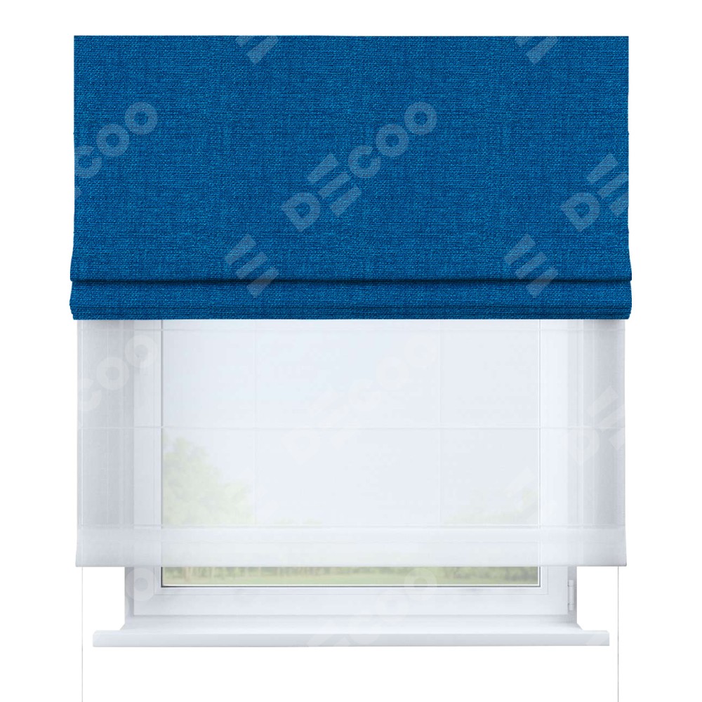 Римская штора день-ночь производителя «Cortin», используется для проёма, пошита из двух полотен, с лицевой стороны лён синий артикул 63742, вторая ткань тюль (по стандарту комплектуется тюль белого цвета артикул V-01). Имеет универсальный механизм и подходит для монтажа: на потолок, на стену и в нишу.