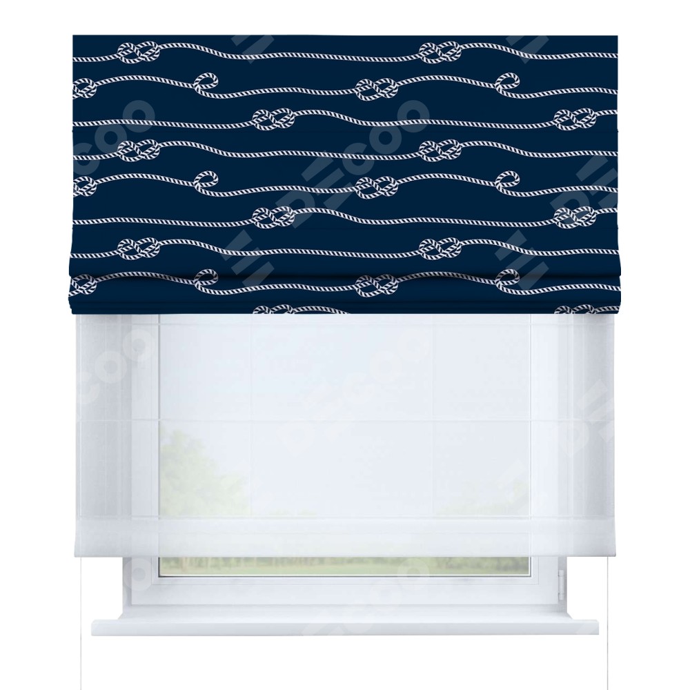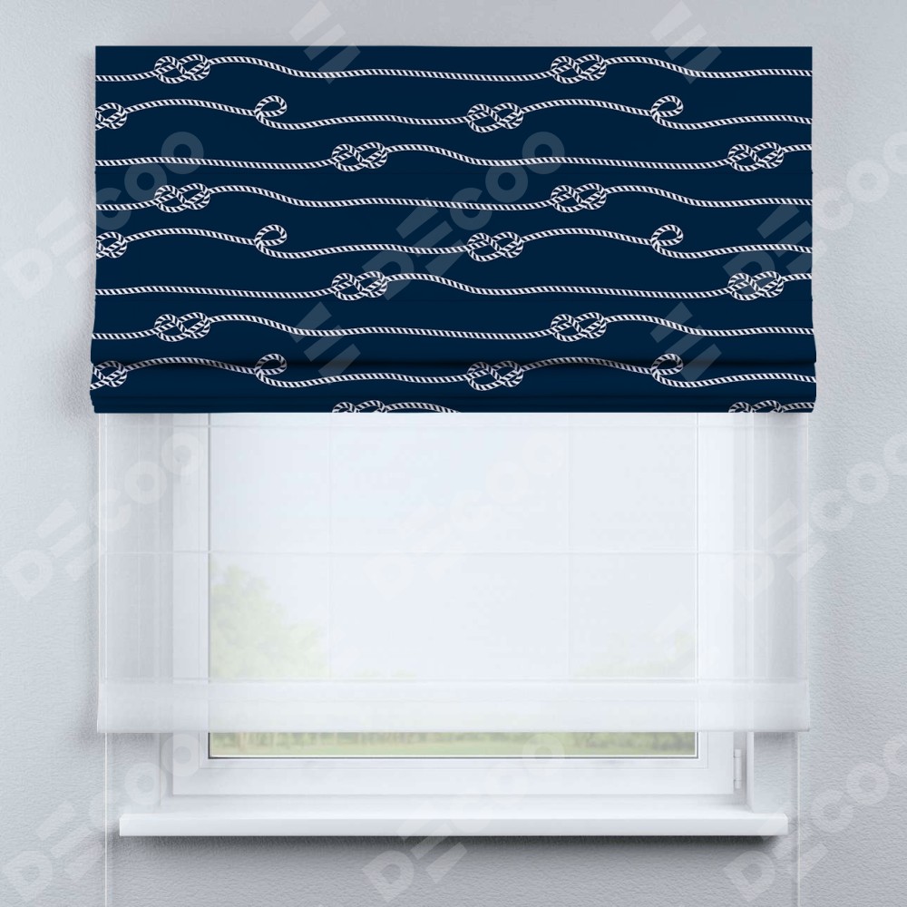 Римская штора день-ночь производителя «Cortin», используется для проёма, пошита из двух полотен, с лицевой блэкаут с нанесением сублимационной печати «Морской узел», вторая ткань тюль (по стандарту комплектуется тюль белого цвета артикул V-01). Имеет универсальный механизм и подходит для монтажа: на потолок, на стену и в нишу.