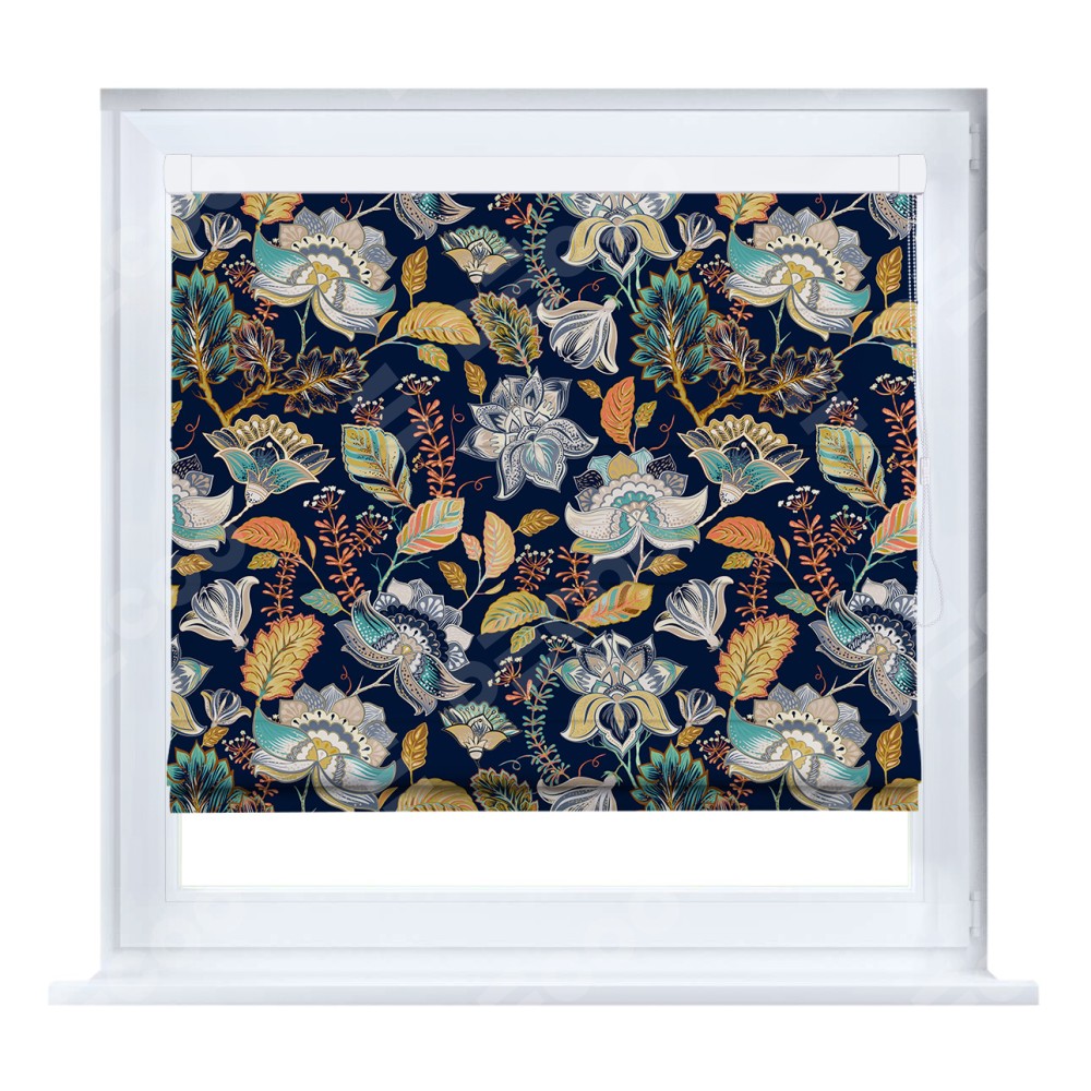 Римская штора кассетного типа, производителя «Cortin», устанавливается только на пластиковые окна и прилегает к стеклопакету, пошита из ткани блэкаут с нанесением сублимационной печати «Тёмный букет».