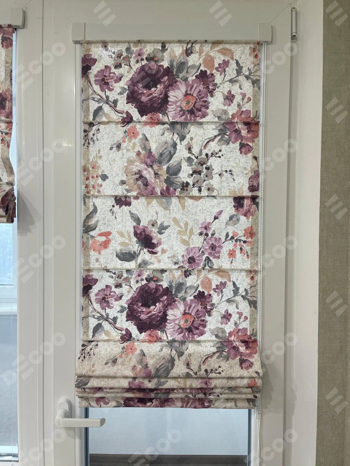 Римская штора производителя «Cortin», устанавливается на створку окна, пошита из ткани «Пионы». Штора шьётся по индивидуальным размерам, для данного типа римской шторы возможная ширина от 35 до 150 см., высота до 250 см.
