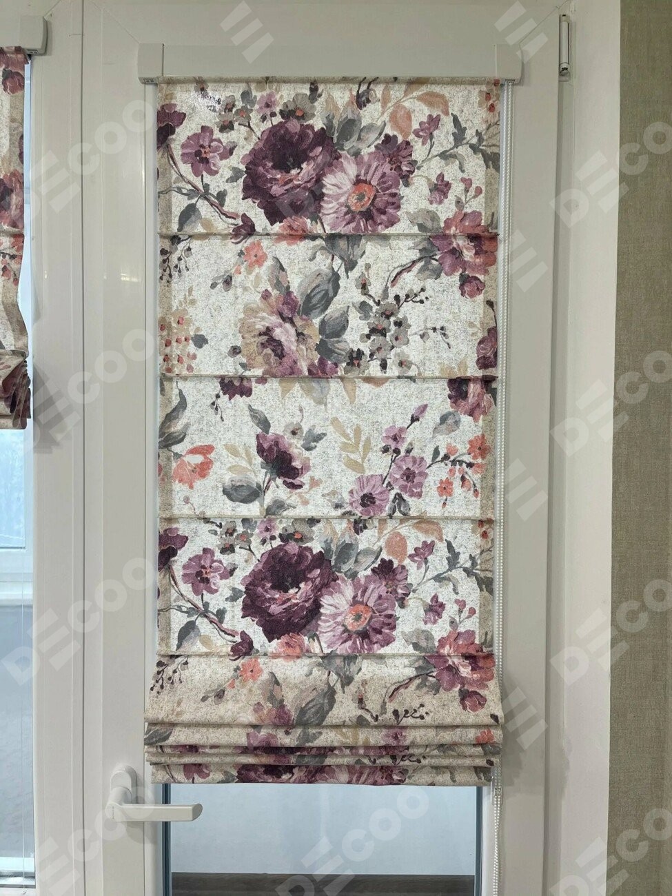 Римская штора производителя «Cortin», устанавливается на створку окна, пошита из ткани «Пионы». Штора шьётся по индивидуальным размерам, для данного типа римской шторы возможная ширина от 35 до 150 см., высота до 250 см.