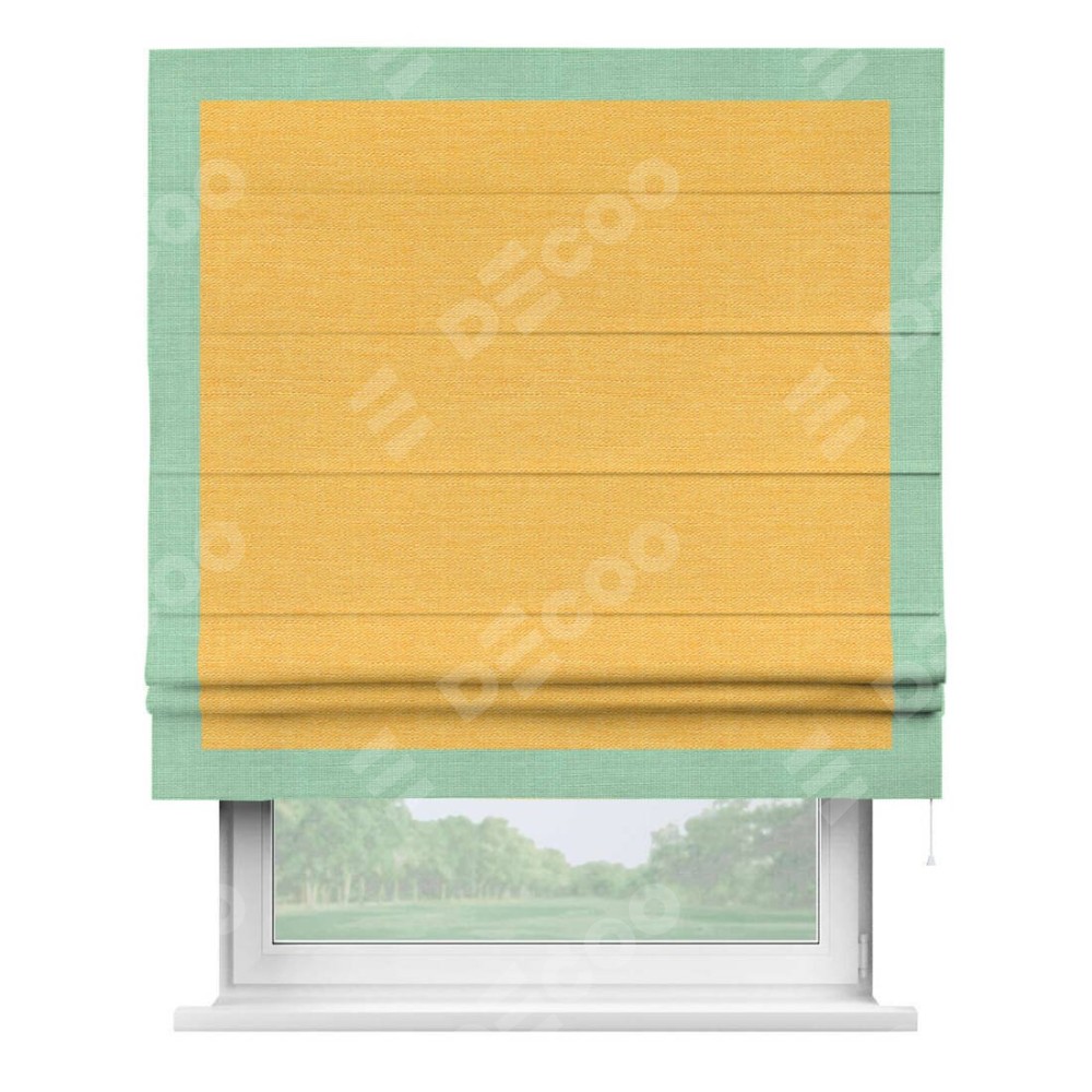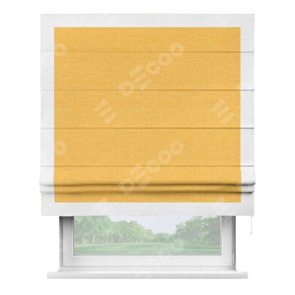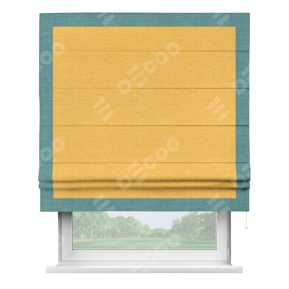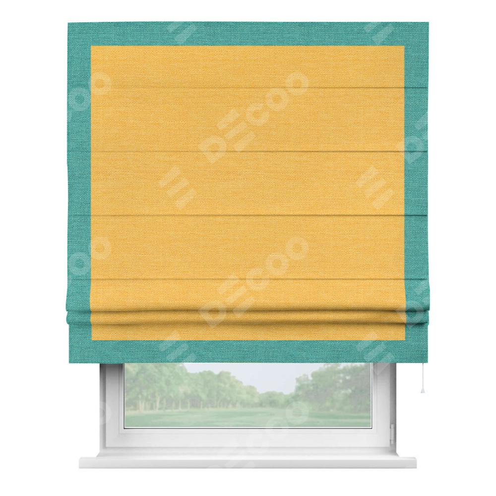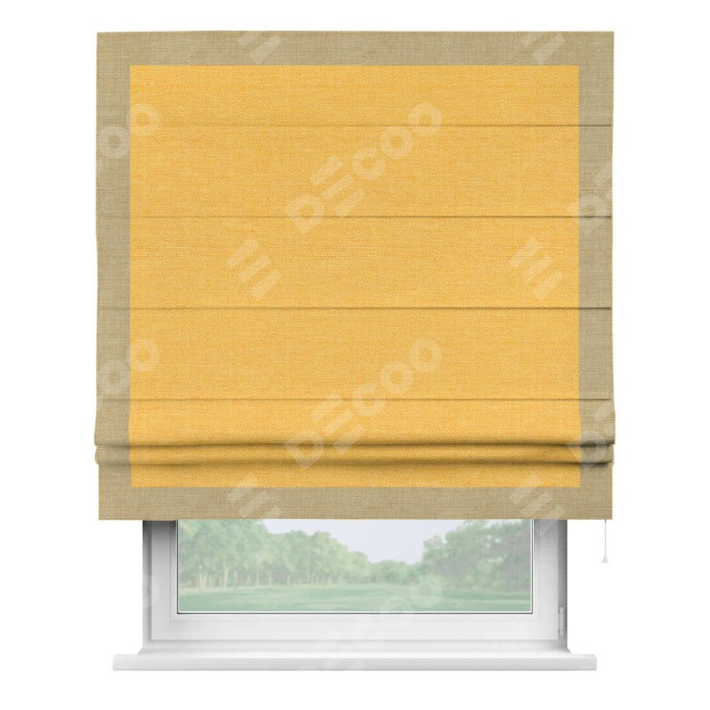 Римская штора производителя «Cortin», используется для проёма, пошита из ткани лён желтый, артикул 63738. Отделка шторы кантом «Чесс», ткань для канта используется из льна разной расцветки на выбор. Имеет универсальный механизм и подходит для монтажа: на потолок, на стену и в нишу.