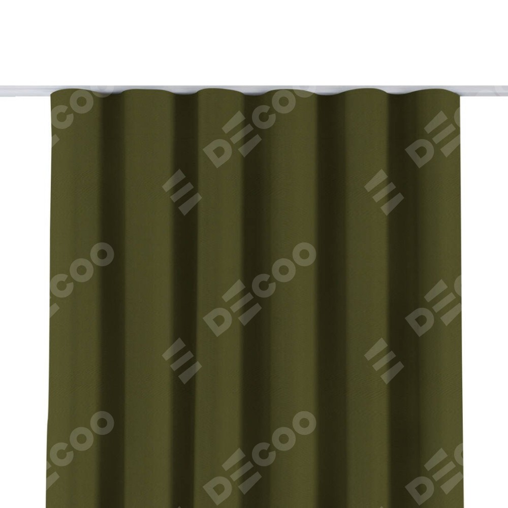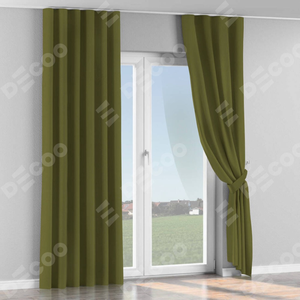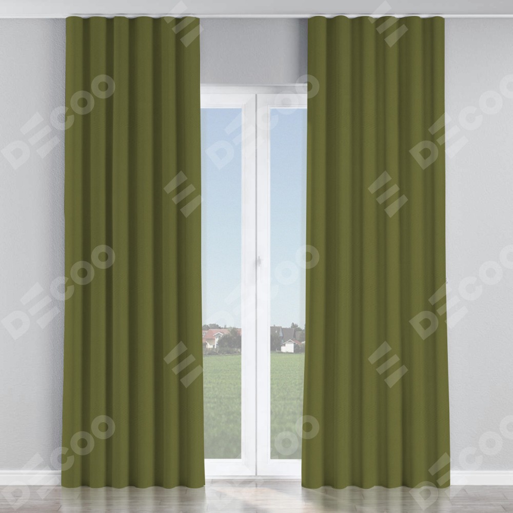 Комплект прямых штор, от производителя «Cortin», пошиты из ткани блэкаут однотонный зелёный, артикул ткани 81859. С изнаночной стороны в верхней части штор пристрачивается шторная лента с декоративными складками «Волна». Для создания элегантных складок прямые шторы шьются по стандарту с коэффициентом 1:2 (на 100 см. ширины проёма 200 см. ширины ткани).