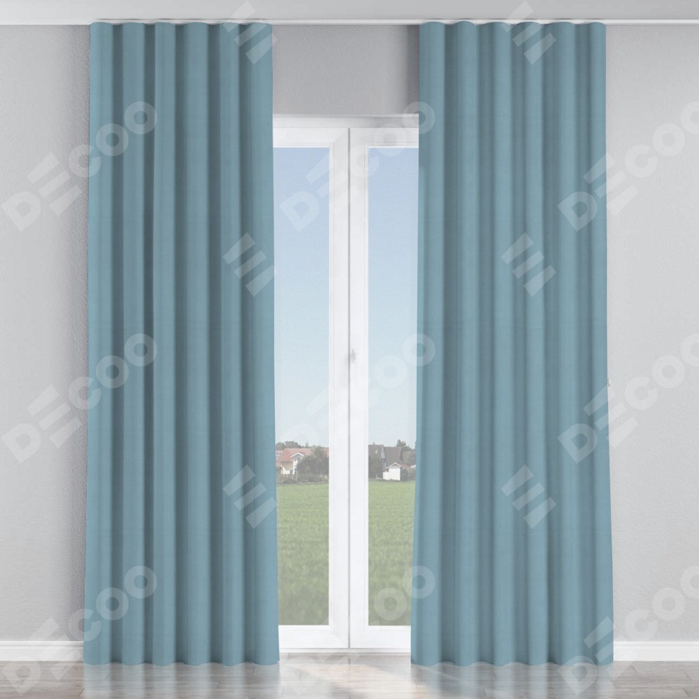 Комплект прямых штор, от производителя «Cortin», пошиты из ткани блэкаут однотонный серо-голубой, артикул ткани 29327. С изнаночной стороны в верхней части штор пристрачивается шторная лента с декоративными складками «Волна». Для создания элегантных складок прямые шторы шьются по стандарту с коэффициентом 1:2 (на 100 см. ширины проёма 200 см. ширины ткани).