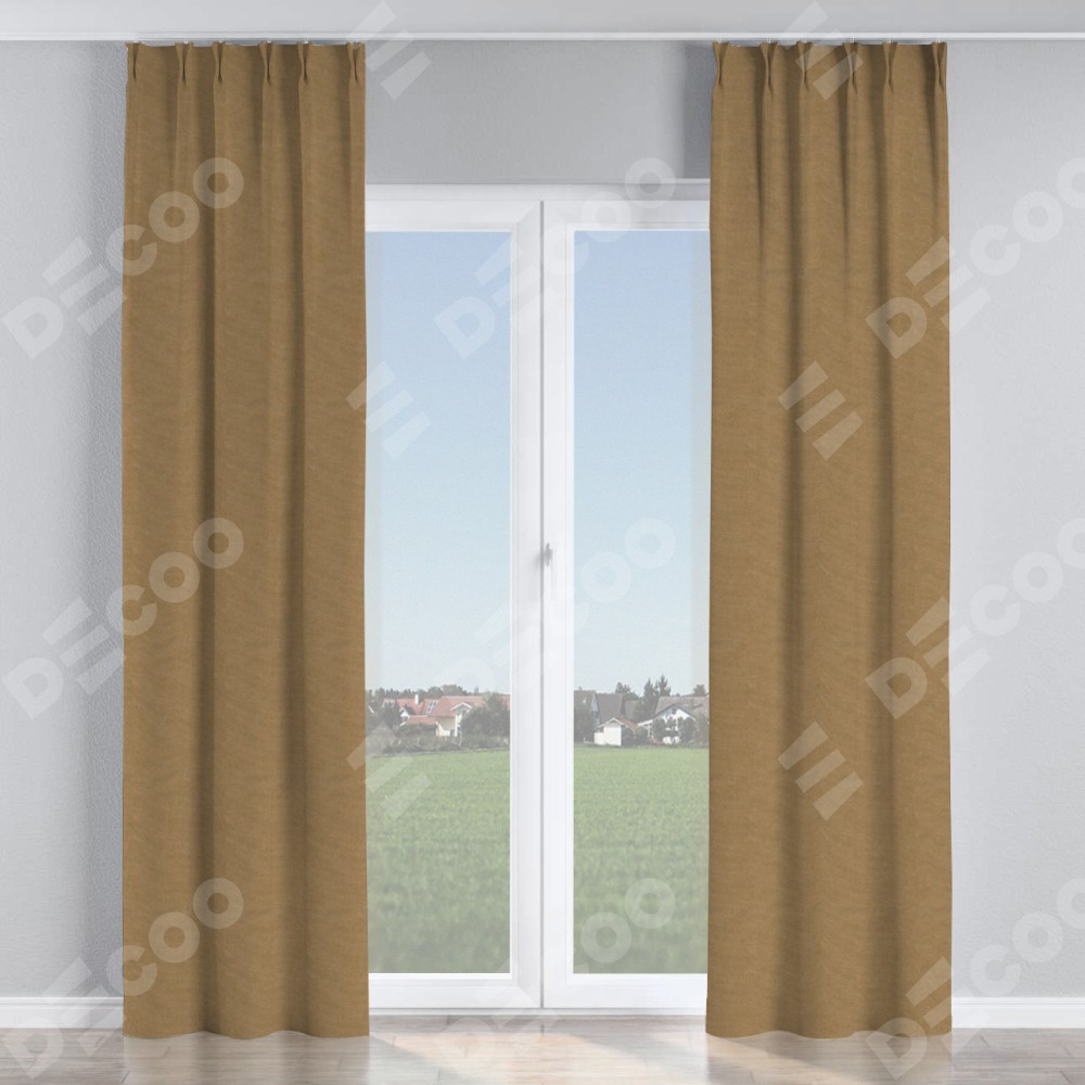 Комплект прямых штор, от производителя «Cortin», пошиты из ткани лён димаут коричневый, артикул ткани 83026. С изнаночной стороны в верхней части штор пристрачивается шторная лента с декоративными складками «Кустик». Для создания элегантных складок прямые шторы шьются по стандарту с коэффициентом 1:2 (на 100 см. ширины проёма 200 см. ширины ткани).