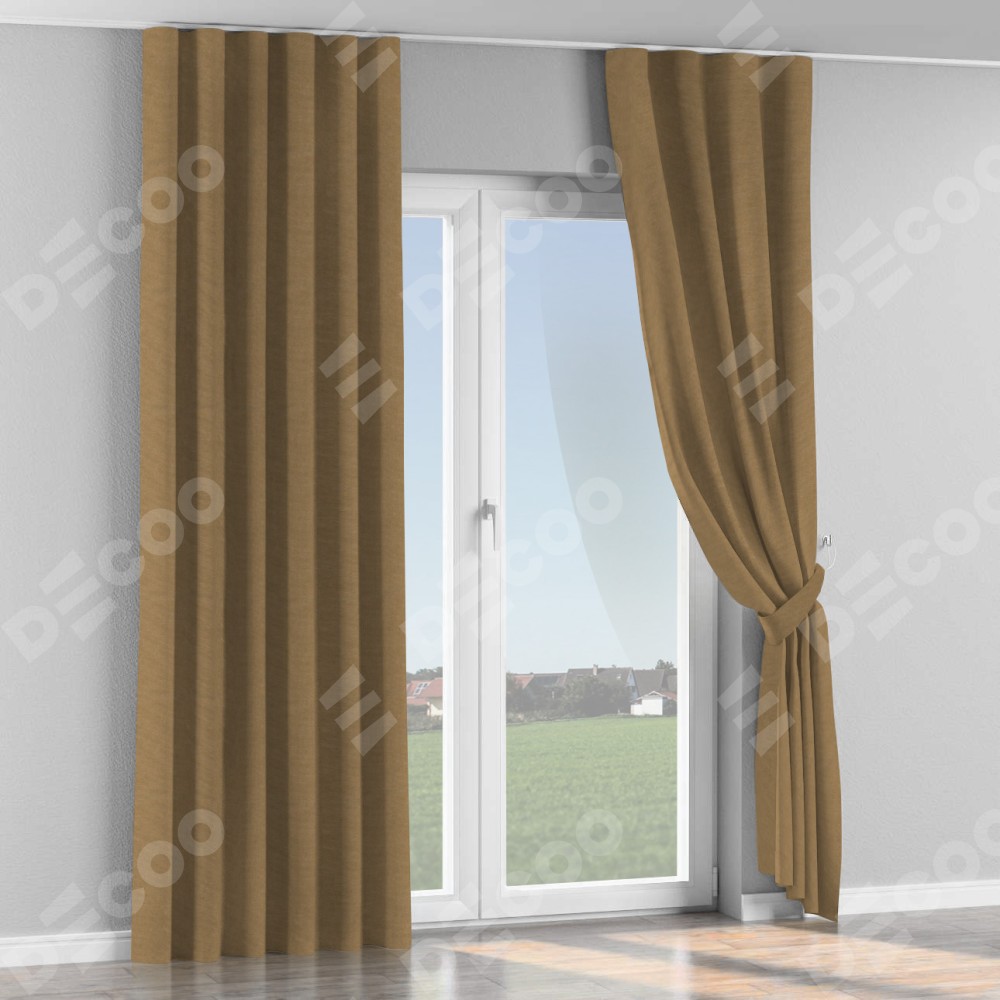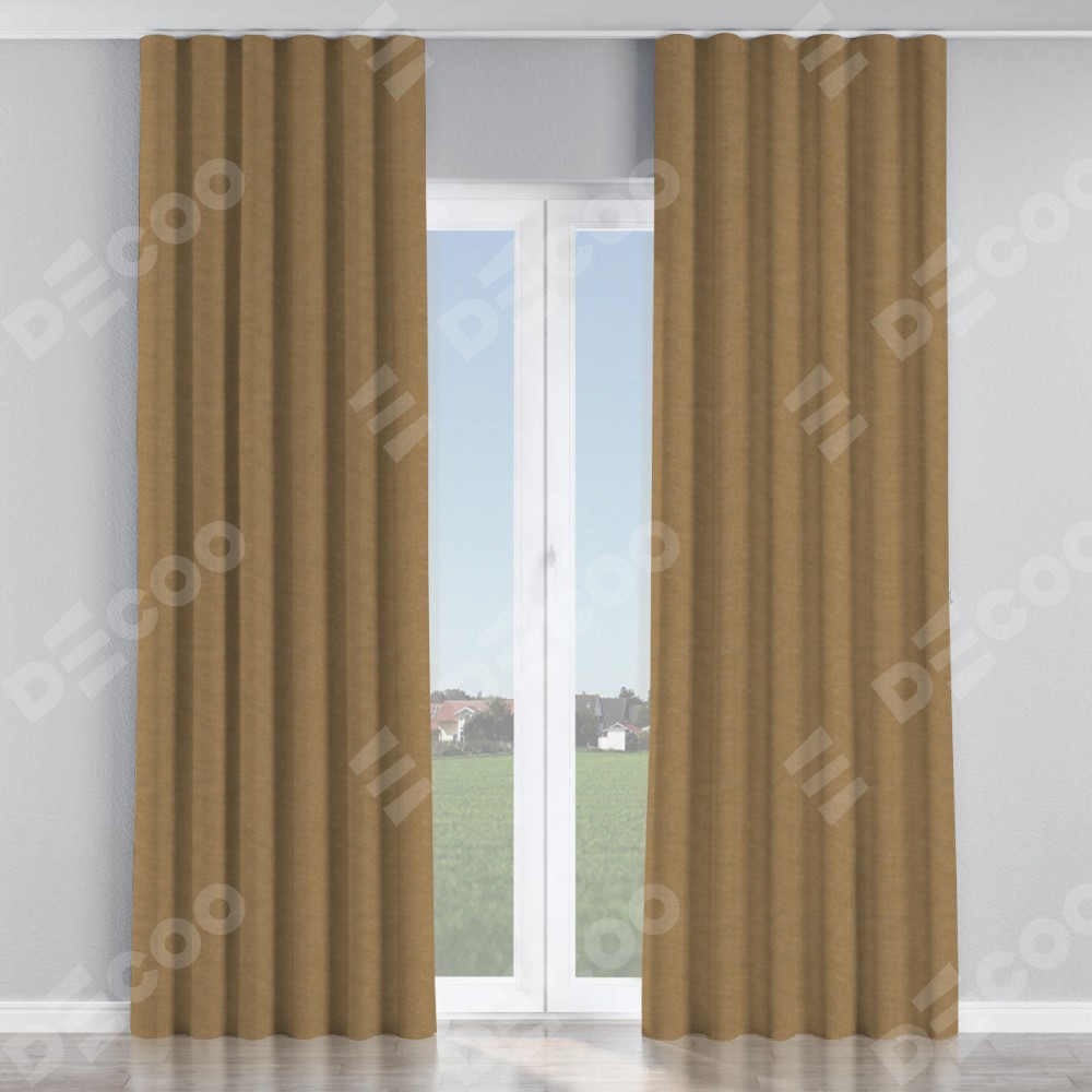 Комплект прямых штор, от производителя «Cortin», пошиты из ткани лён димаут коричневый, артикул ткани 83026. С изнаночной стороны в верхней части штор пристрачивается шторная лента с декоративными складками «Волна». Для создания элегантных складок прямые шторы шьются по стандарту с коэффициентом 1:2 (на 100 см. ширины проёма 200 см. ширины ткани).