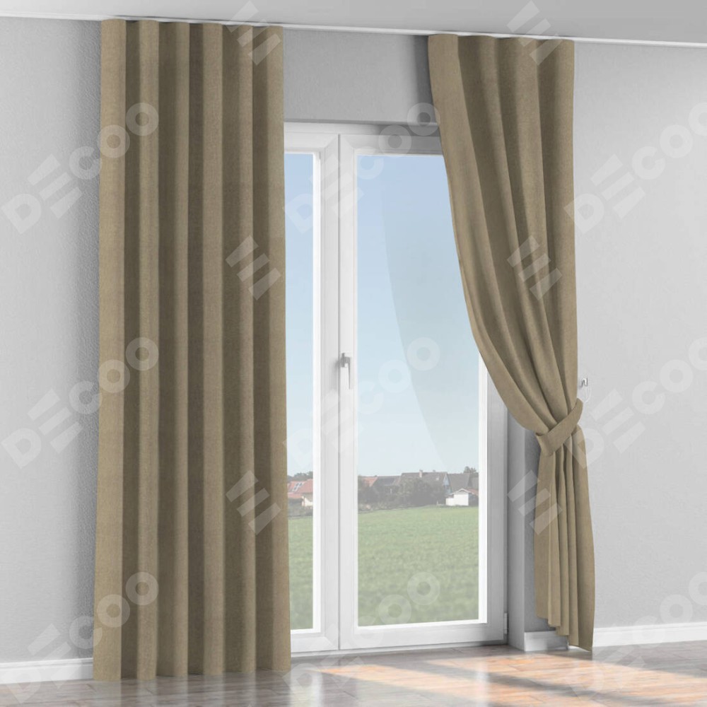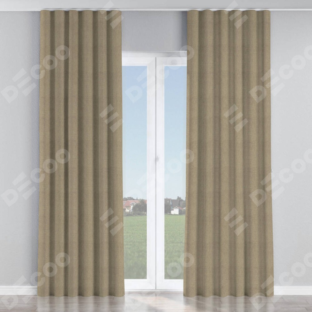 Комплект прямых штор, от производителя «Cortin», пошиты из ткани твид блэкаут кофе, артикул ткани 21575. С изнаночной стороны в верхней части штор пристрачивается шторная лента с декоративными складками «Волна». Для создания элегантных складок прямые шторы шьются по стандарту с коэффициентом 1:2 (на 100 см. ширины проёма 200 см. ширины ткани).