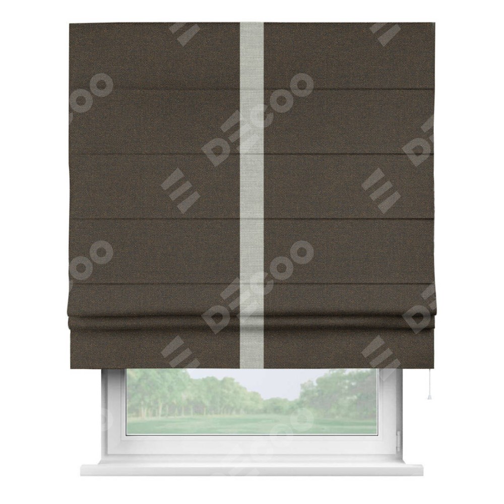 Римская штора производителя «Cortin», используется для проёма, пошита из ткани лён темно-коричневый, артикул 53444. Отделка шторы кантом «Хайвэй», ткань для канта используется из льна разной расцветки на выбор. Имеет универсальный механизм и подходит для монтажа: на потолок, на стену и в нишу.