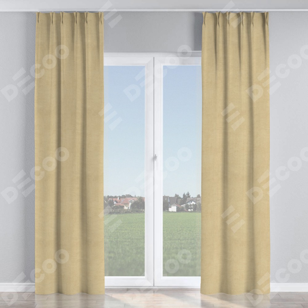 Комплект прямых штор, от производителя «Cortin», пошиты из ткани вельвет бежевый, артикул ткани 85538. С изнаночной стороны в верхней части штор пристрачивается шторная лента с декоративными складками «Кустик». Для создания элегантных складок прямые шторы шьются по стандарту с коэффициентом 1:2 (на 100 см. ширины проёма 200 см. ширины ткани).