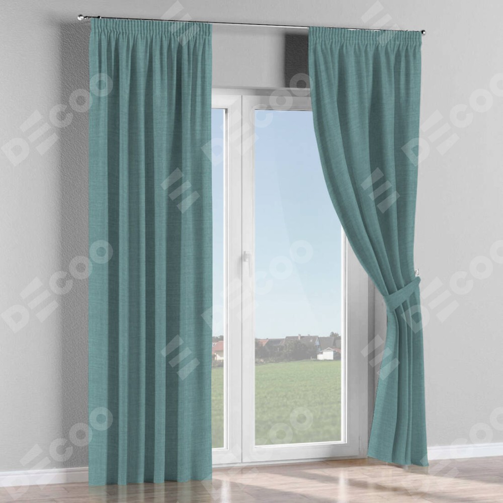Комплект прямых штор, от производителя «Cortin», пошиты из ткани лён голубой, артикул ткани 74736. С изнаночной стороны в верхней части штор пристрачивается шторная лента с декоративными складками «Карандаш». Для создания элегантных складок прямые шторы шьются по стандарту с коэффициентом 1:2 (на 100 см. ширины проёма 200 см. ширины ткани).