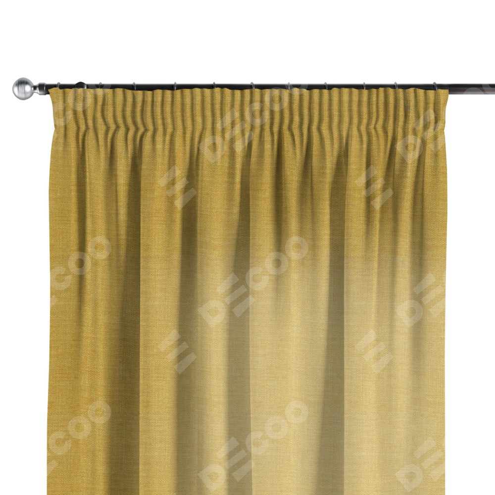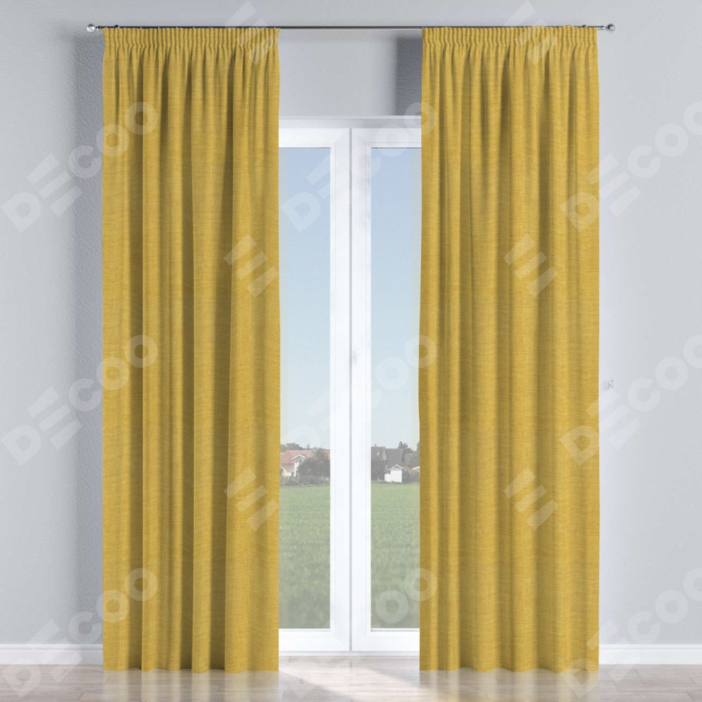 Комплект прямых штор, от производителя «Cortin», пошиты из ткани лён горчичный, артикул ткани 74740. С изнаночной стороны в верхней части штор пристрачивается шторная лента с декоративными складками «Карандаш». Для создания элегантных складок прямые шторы шьются по стандарту с коэффициентом 1:2 (на 100 см. ширины проёма 200 см. ширины ткани).