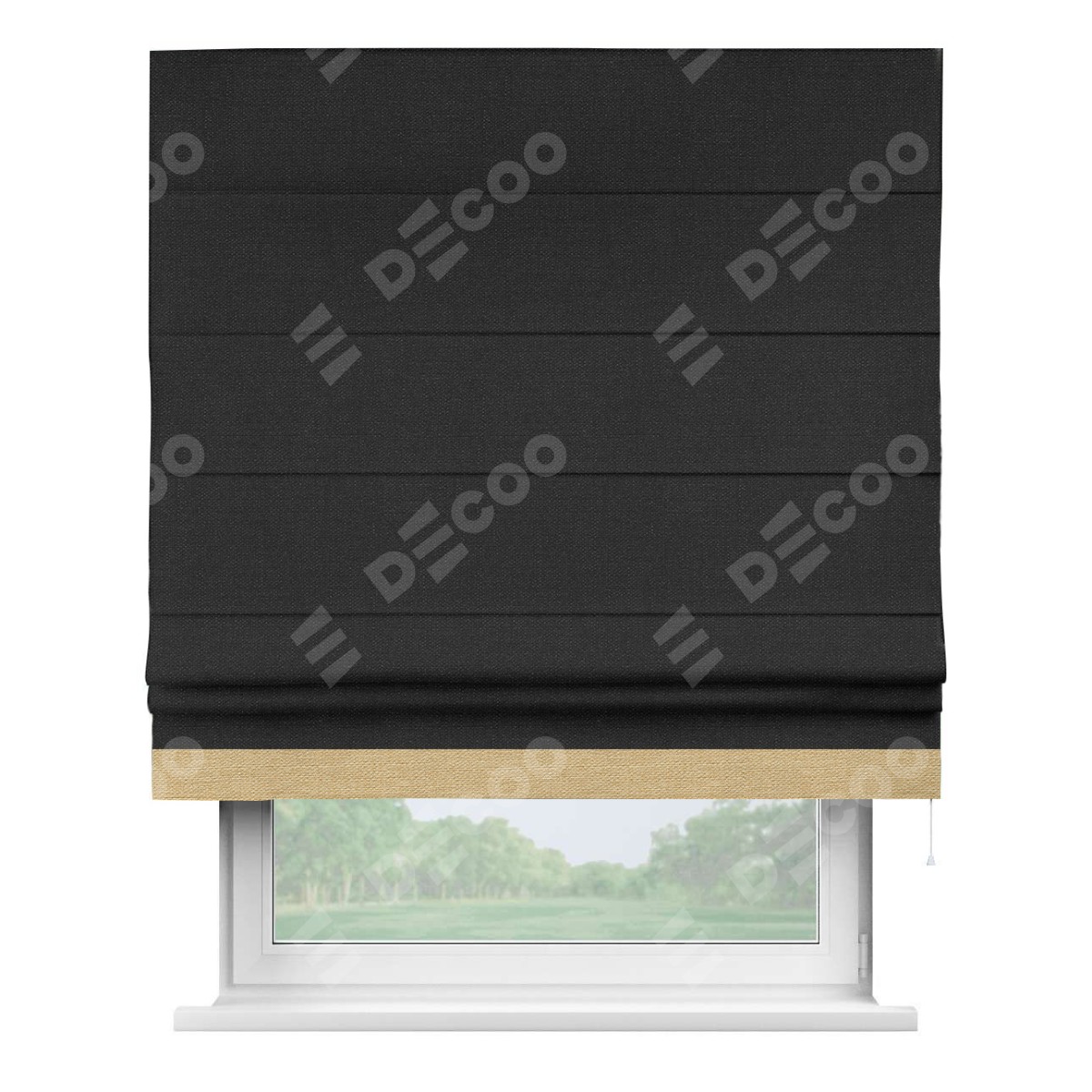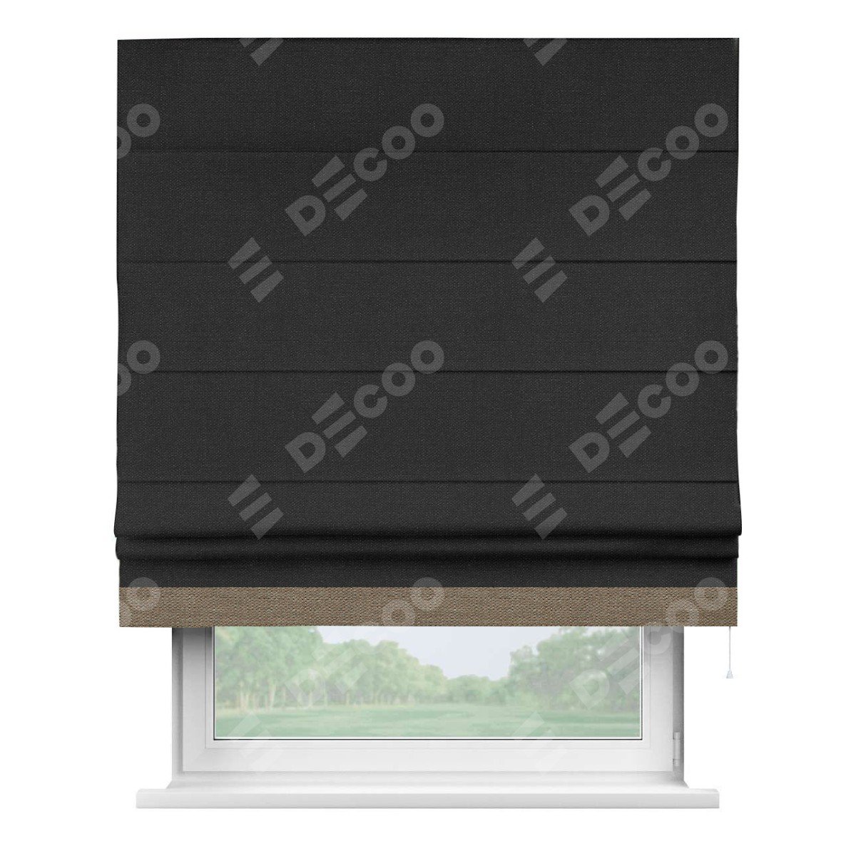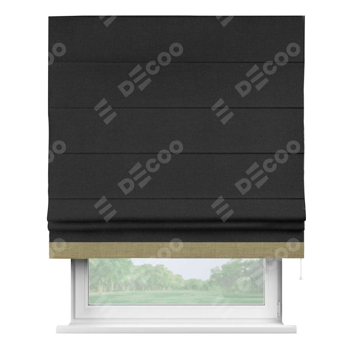 Римская штора производителя «Cortin», используется для проёма, пошита из ткани лён черный, артикул 85927. Отделка шторы кантом «Джестер», ткань для канта используется из льна разной расцветки на выбор. Имеет универсальный механизм и подходит для монтажа: на потолок, на стену и в нишу.