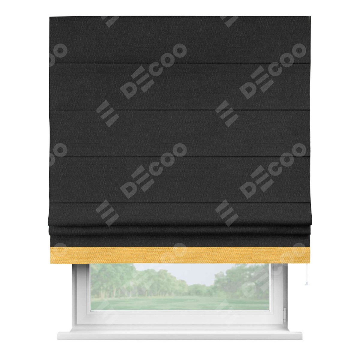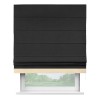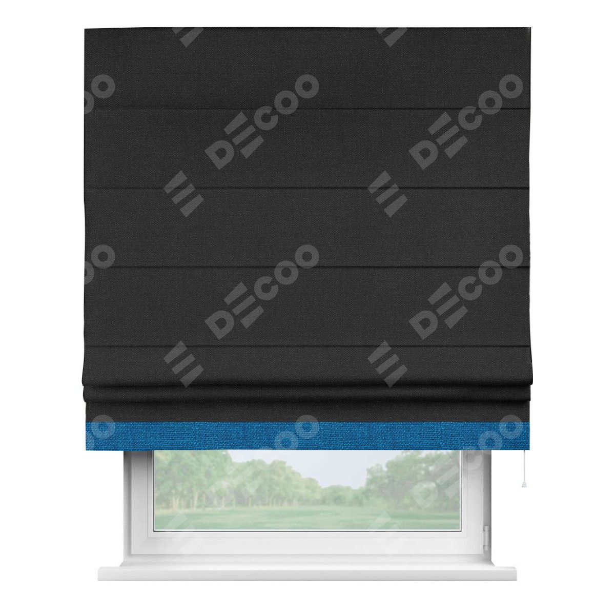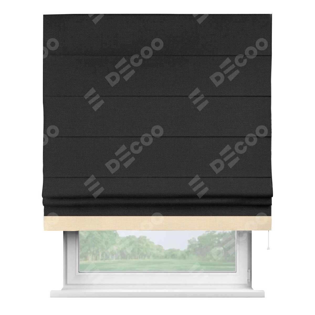 Римская штора производителя «Cortin», используется для проёма, пошита из ткани лён черный, артикул 85927. Отделка шторы кантом «Джестер», ткань для канта используется из льна разной расцветки на выбор. Имеет универсальный механизм и подходит для монтажа: на потолок, на стену и в нишу.