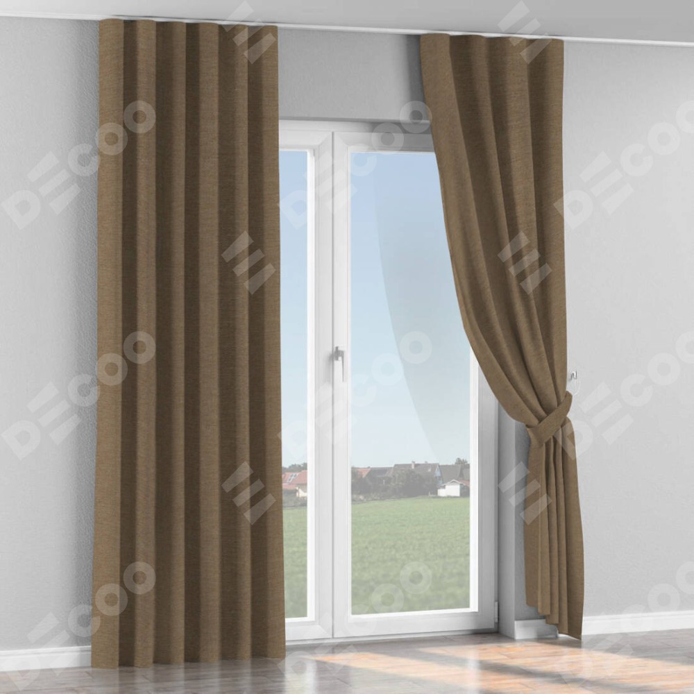 Комплект прямых штор, от производителя «Cortin», пошиты из ткани лён светло-коричневый, артикул ткани 53434. С изнаночной стороны в верхней части штор пристрачивается шторная лента с декоративными складками «Волна». Для создания элегантных складок прямые шторы шьются по стандарту с коэффициентом 1:2 (на 100 см. ширины проёма 200 см. ширины ткани).
