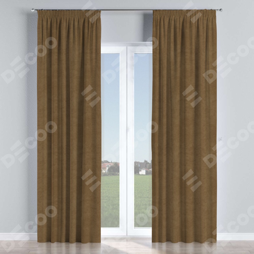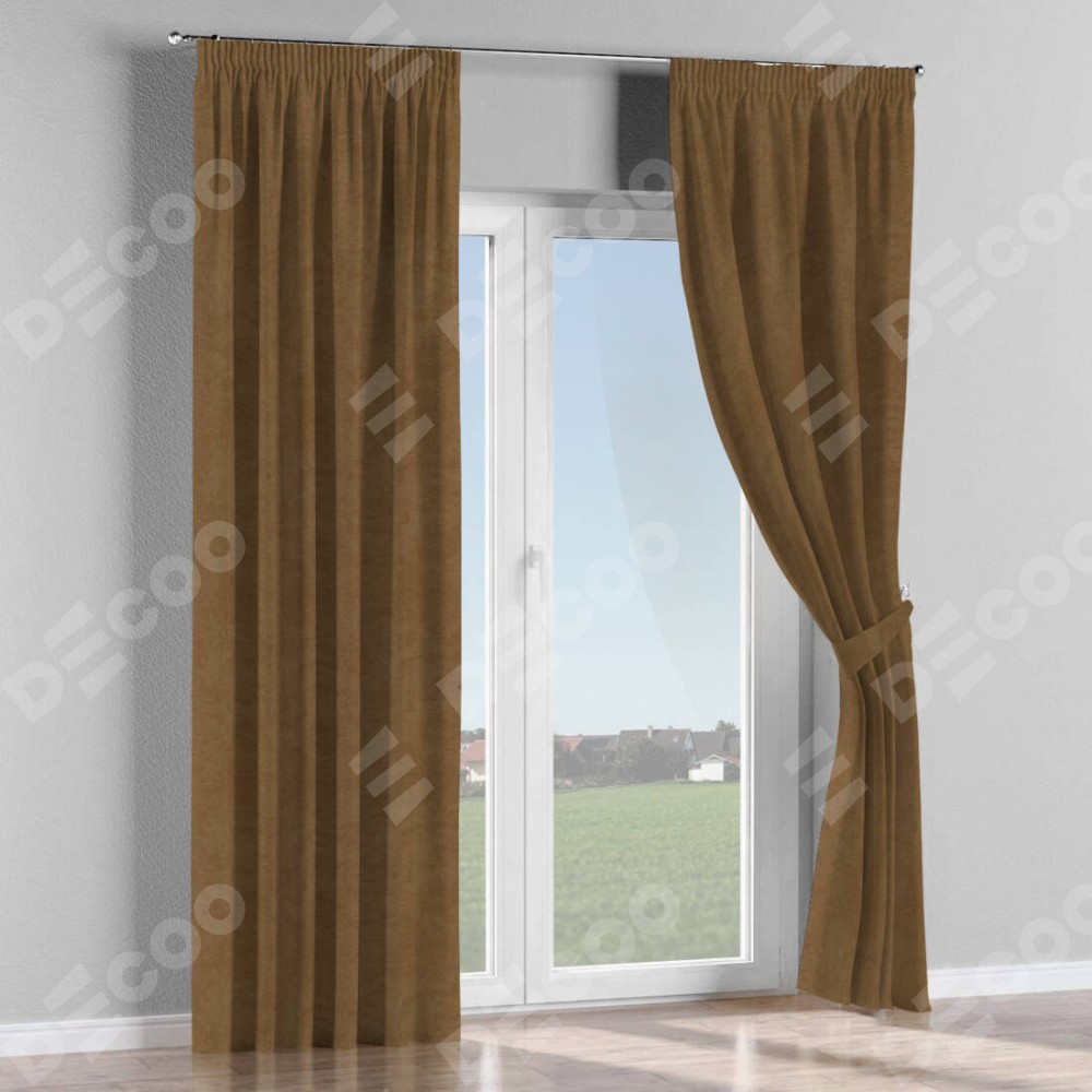 Комплект прямых штор, от производителя «Cortin», пошиты из ткани софт однотонный бронзовый, артикул ткани 33099. С изнаночной стороны в верхней части штор пристрачивается шторная лента с декоративными складками «Карандаш». Для создания элегантных складок прямые шторы шьются по стандарту с коэффициентом 1:2 (на 100 см. ширины проёма 200 см. ширины ткани).