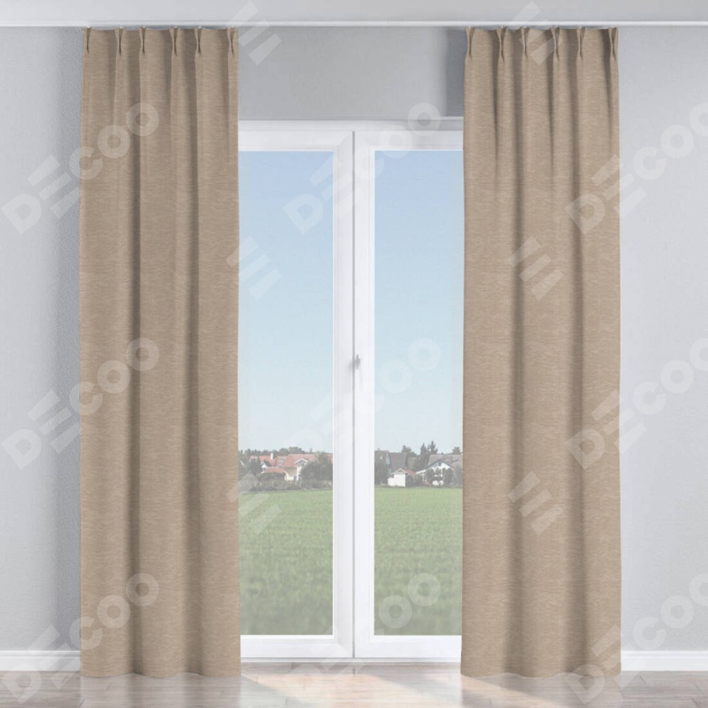 Комплект прямых штор, от производителя «Cortin», пошиты из ткани софт однотонный тёмно-бежевый, артикул ткани 1640. С изнаночной стороны в верхней части штор пристрачивается шторная лента с декоративными складками «Кустик». Для создания элегантных складок прямые шторы шьются по стандарту с коэффициентом 1:2 (на 100 см. ширины проёма 200 см. ширины ткани).