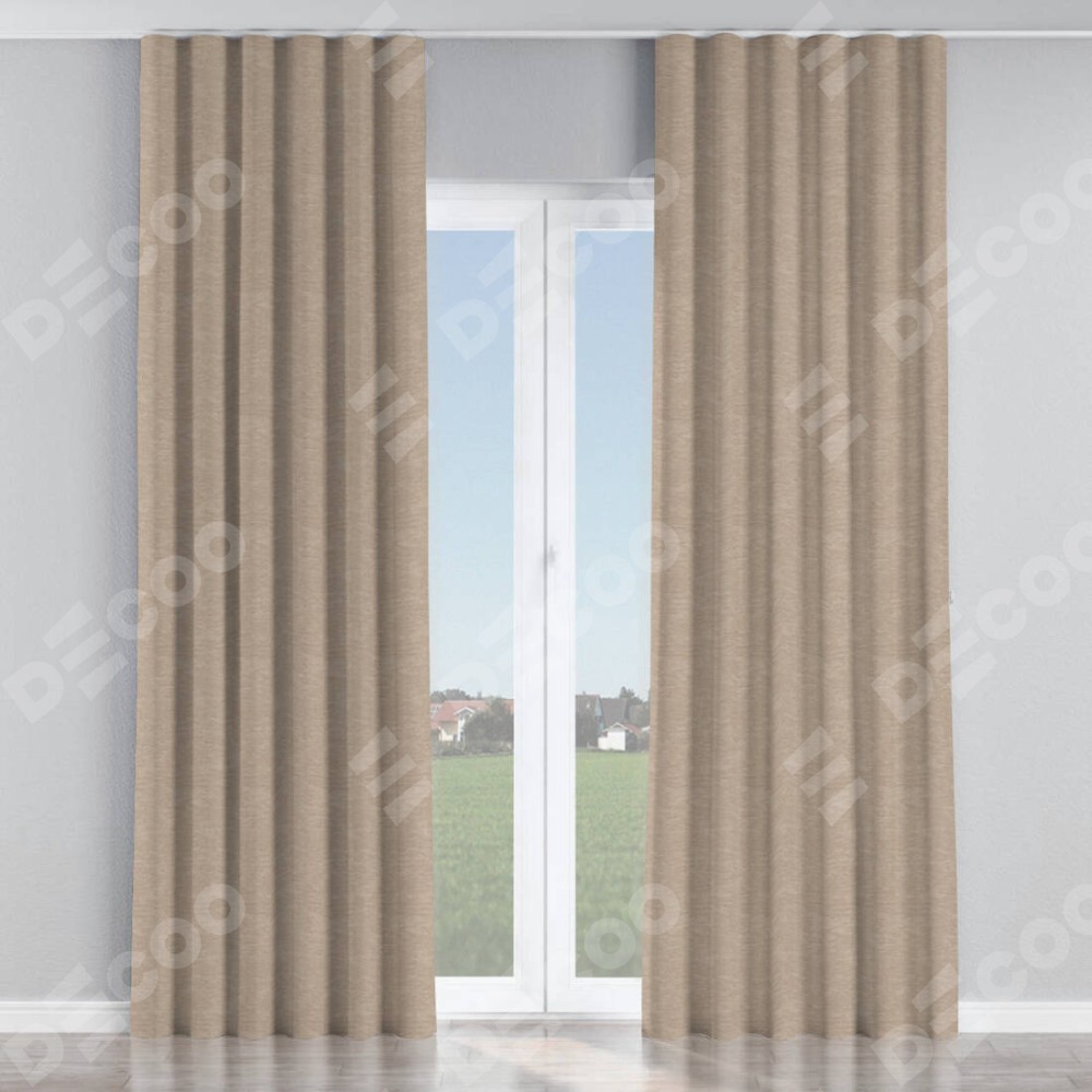 Комплект прямых штор, от производителя «Cortin», пошиты из ткани софт однотонный тёмно-бежевый, артикул ткани 1640. С изнаночной стороны в верхней части штор пристрачивается шторная лента с декоративными складками «Волна». Для создания элегантных складок прямые шторы шьются по стандарту с коэффициентом 1:2 (на 100 см. ширины проёма 200 см. ширины ткани).