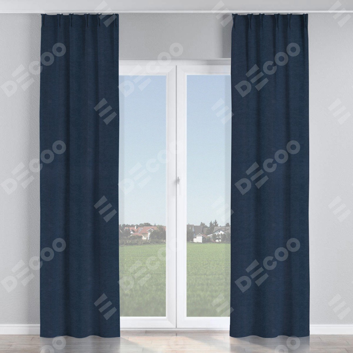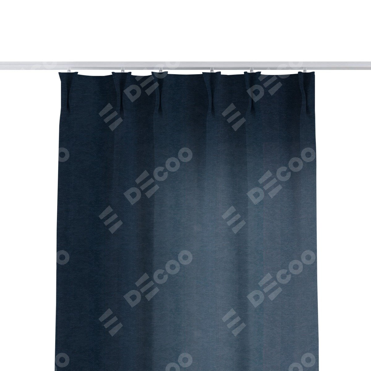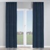 Комплект прямых штор, от производителя «Cortin», пошиты из ткани софт однотонный тёмно-синий, артикул ткани 33111. С изнаночной стороны в верхней части штор пристрачивается шторная лента с декоративными складками «Кустик». Для создания элегантных складок прямые шторы шьются по стандарту с коэффициентом 1:2 (на 100 см. ширины проёма 200 см. ширины ткани).