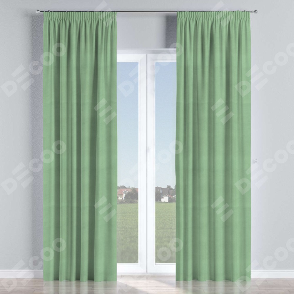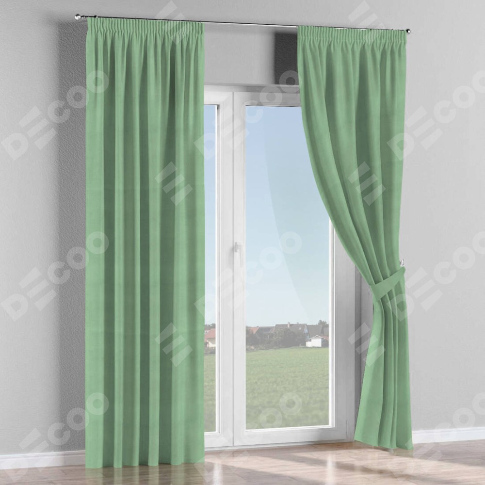 Комплект прямых штор, от производителя «Cortin», пошиты из ткани бархат оливковый, артикул ткани 18746. С изнаночной стороны в верхней части штор пристрачивается шторная лента с декоративными складками «Карандаш». Для создания элегантных складок прямые шторы шьются по стандарту с коэффициентом 1:2 (на 100 см. ширины проёма 200 см. ширины ткани).