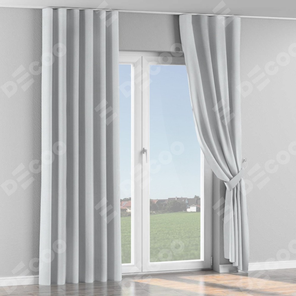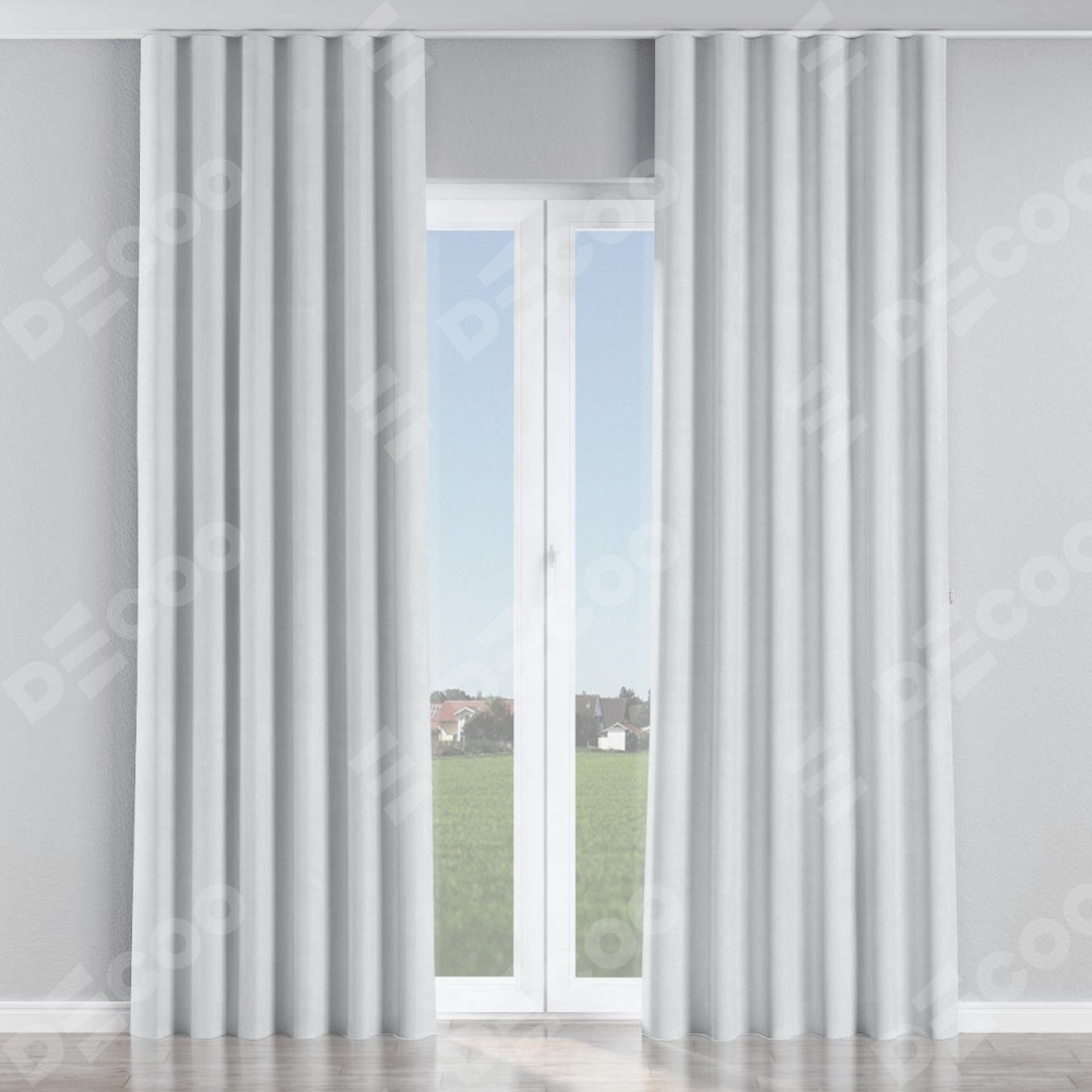 Комплект прямых штор, от производителя «Cortin», пошиты из ткани блэкаут однотонный дымчато-белый, артикул ткани 101. С изнаночной стороны в верхней части штор пристрачивается шторная лента с декоративными складками «Волна». Для создания элегантных складок прямые шторы шьются по стандарту с коэффициентом 1:2 (на 100 см. ширины проёма 200 см. ширины ткани).