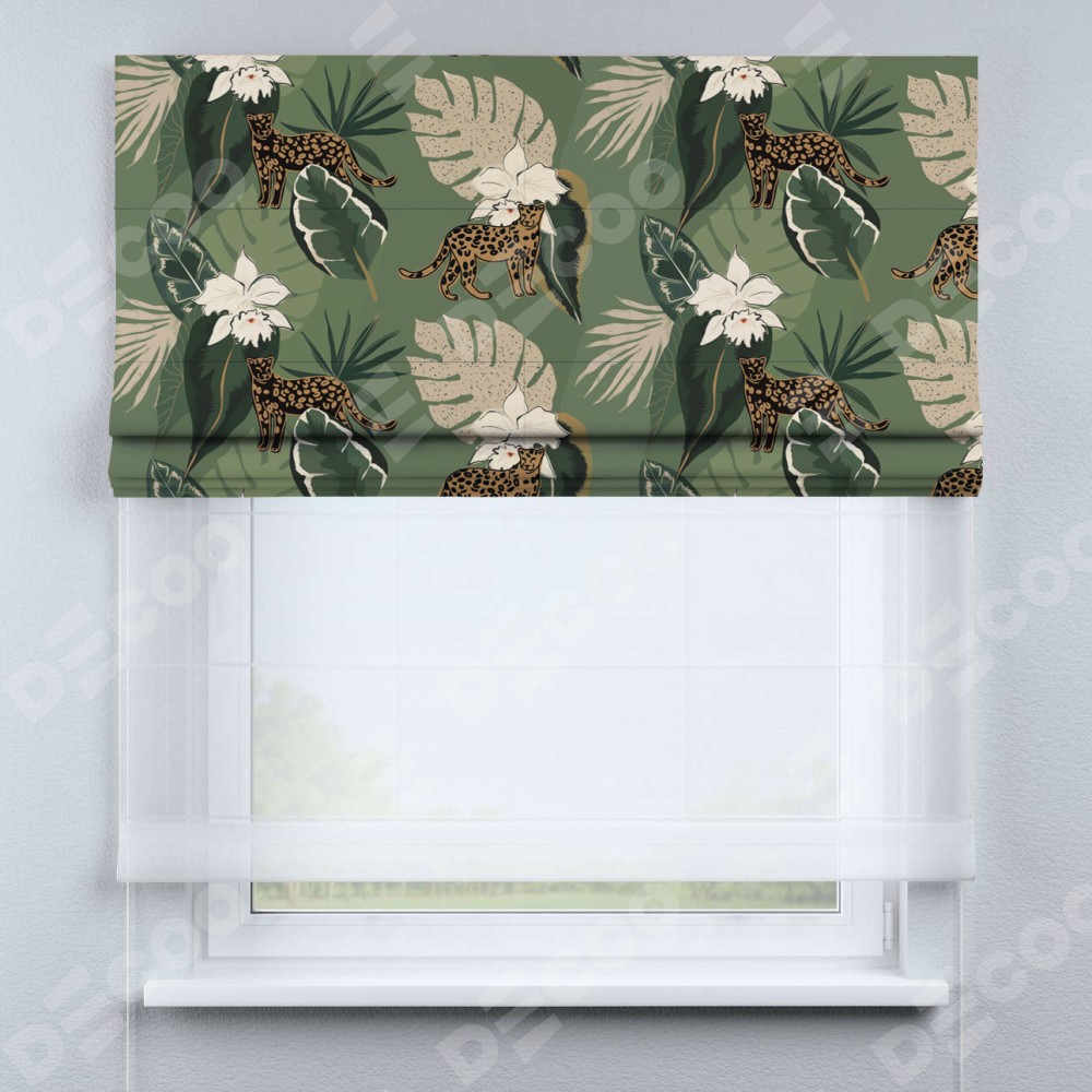 Римская штора день-ночь производителя «Cortin», используется для проёма, пошита из двух полотен, с лицевой блэкаут с нанесением сублимационной печати «В тропическом лесу», вторая ткань тюль (по стандарту комплектуется тюль белого цвета артикул V-01). Имеет универсальный механизм и подходит для монтажа: на потолок, на стену и в нишу.