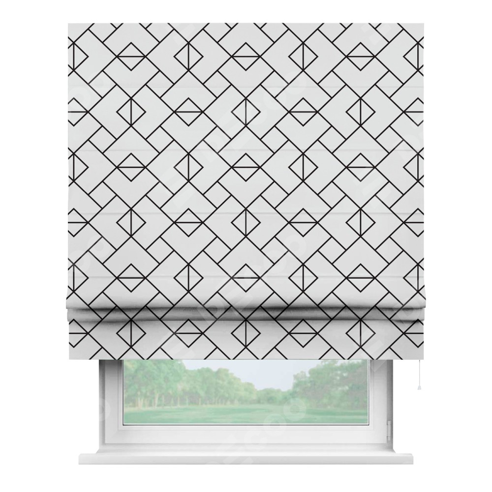 Римская штора производителя «Cortin», используется для проёма, пошита из ткани блэкаут с нанесением сублимационной печати «Геометрический орнамент». Имеет универсальный механизм и подходит для монтажа: на потолок, на стену и в нишу.