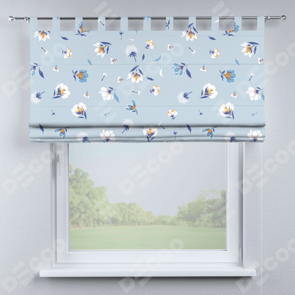 Римская штора производителя «Cortin», используется для проёма, пошита из ткани блэкаут с нанесением сублимационной печати «Голубые цветы». Данная модель пошита на петлях, комплектуется на выбор круглым карнизом и подходит для монтажа на стену. Римская штора на петлях имеет простую систему регулировки высоты, отличительным преимуществом данной модели является простой способ монтажа. Достаточно повесить ее на трубу и штора готова!