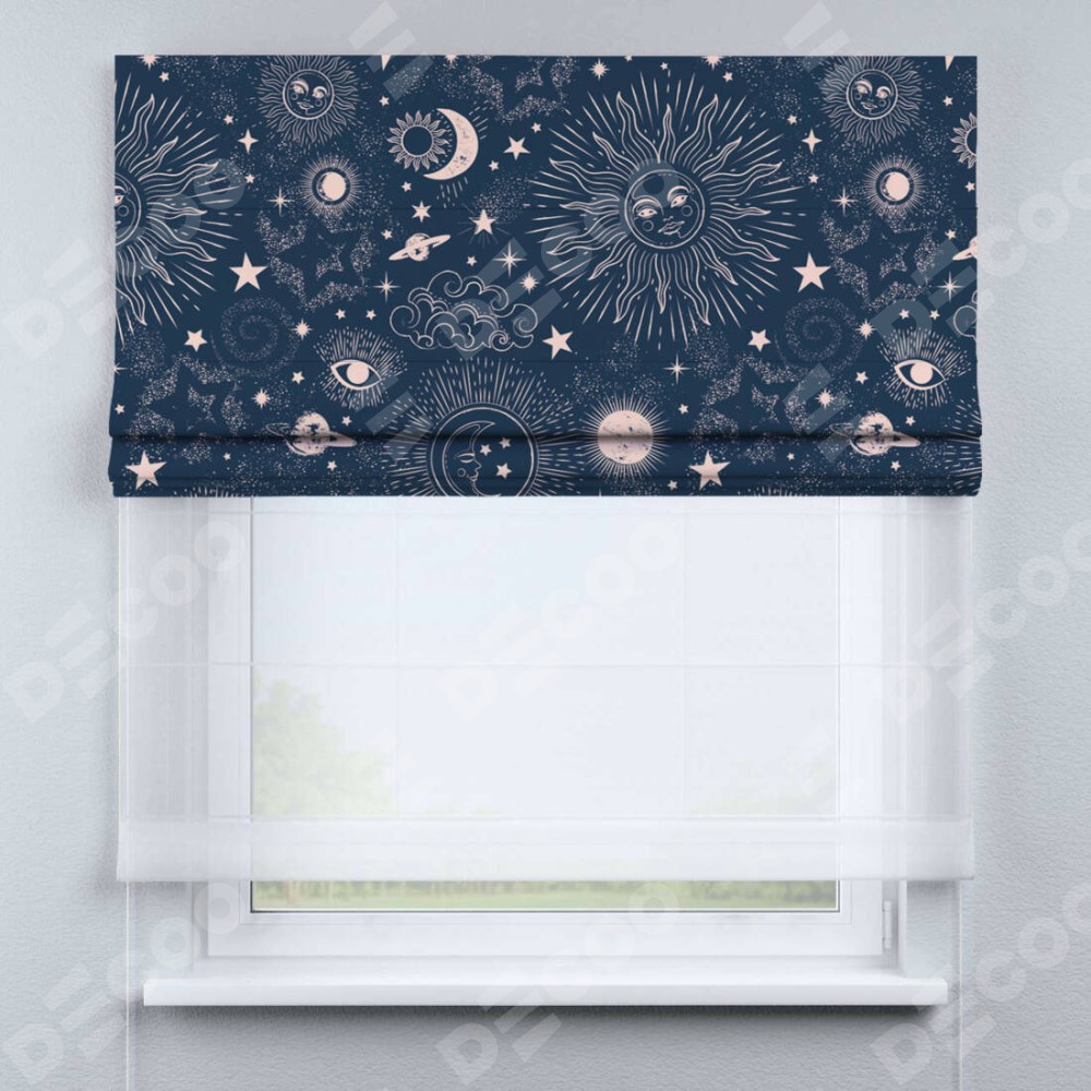 Римская штора день-ночь производителя «Cortin», используется для проёма, пошита из двух полотен, с лицевой блэкаут с нанесением сублимационной печати «Звёзды и планеты», вторая ткань тюль (по стандарту комплектуется тюль белого цвета артикул V-01). Имеет универсальный механизм и подходит для монтажа: на потолок, на стену и в нишу.