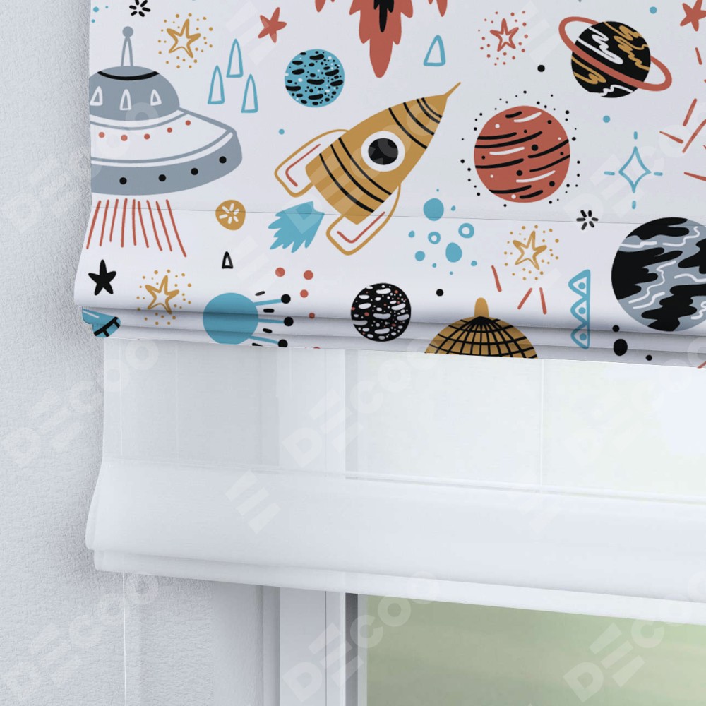 Римская штора день-ночь производителя «Cortin», используется для проёма, пошита из двух полотен, с лицевой блэкаут с нанесением сублимационной печати «Космическое приключение», вторая ткань тюль (по стандарту комплектуется тюль белого цвета артикул V-01). Имеет универсальный механизм и подходит для монтажа: на потолок, на стену и в нишу.