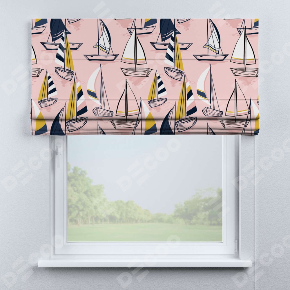 Римская штора производителя «Cortin», используется для проёма, пошита из ткани блэкаут с нанесением сублимационной печати «Парусная регата». Имеет универсальный механизм и подходит для монтажа: на потолок, на стену и в нишу.