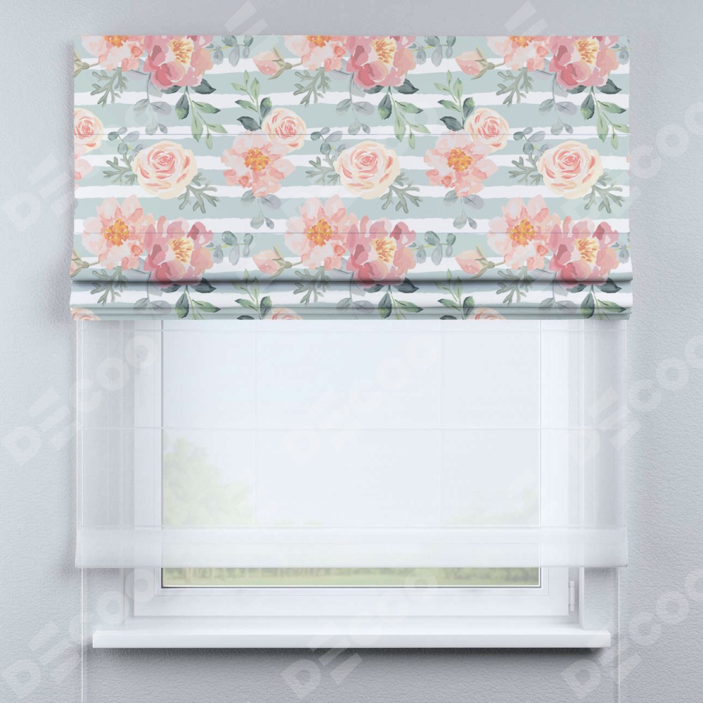Римская штора день-ночь производителя «Cortin», используется для проёма, пошита из двух полотен, с лицевой блэкаут с нанесением сублимационной печати «Розы акварель», вторая ткань тюль (по стандарту комплектуется тюль белого цвета артикул V-01). Имеет универсальный механизм и подходит для монтажа: на потолок, на стену и в нишу.