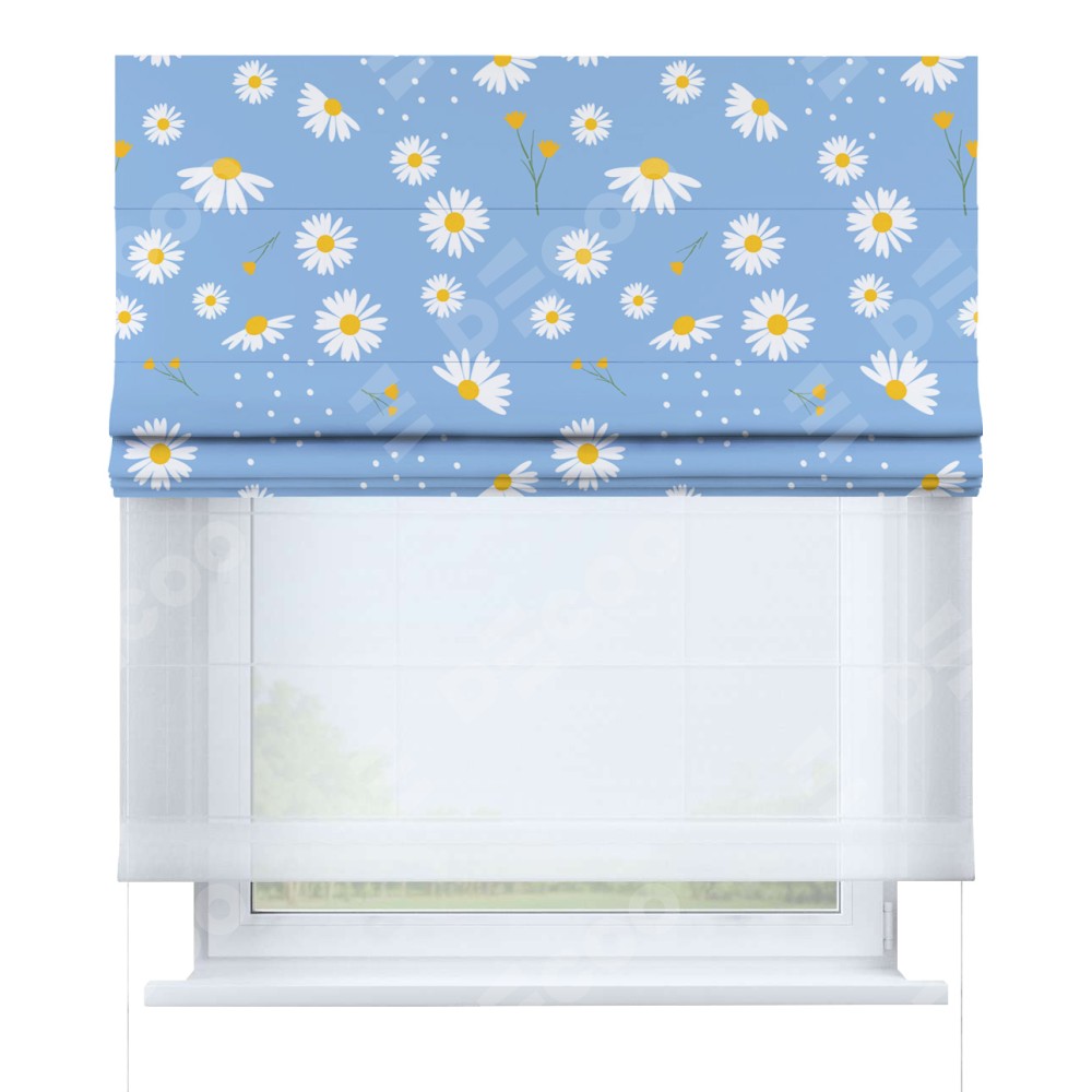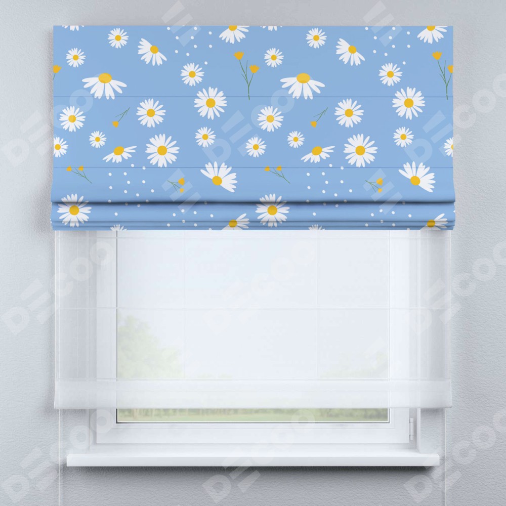 Римская штора день-ночь производителя «Cortin», используется для проёма, пошита из двух полотен, с лицевой блэкаут с нанесением сублимационной печати «Ромашки на голубом», вторая ткань тюль (по стандарту комплектуется тюль белого цвета артикул V-01). Имеет универсальный механизм и подходит для монтажа: на потолок, на стену и в нишу.