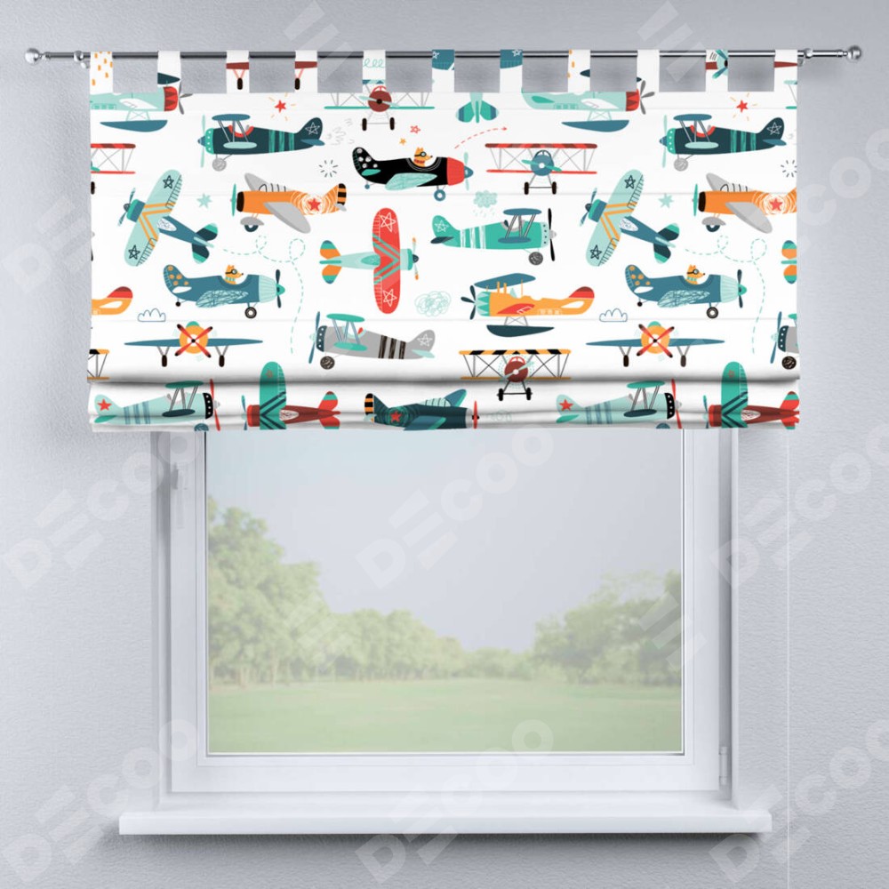 Римская штора производителя «Cortin», используется для проёма, пошита из ткани блэкаут с нанесением сублимационной печати «Самолёты и пилоты». Данная модель пошита на петлях, комплектуется на выбор круглым карнизом и подходит для монтажа на стену. Римская штора на петлях имеет простую систему регулировки высоты, отличительным преимуществом данной модели является простой способ монтажа. Достаточно повесить ее на трубу и штора готова!