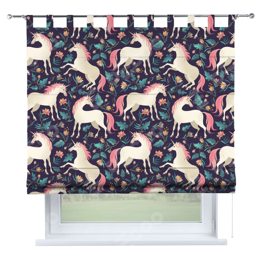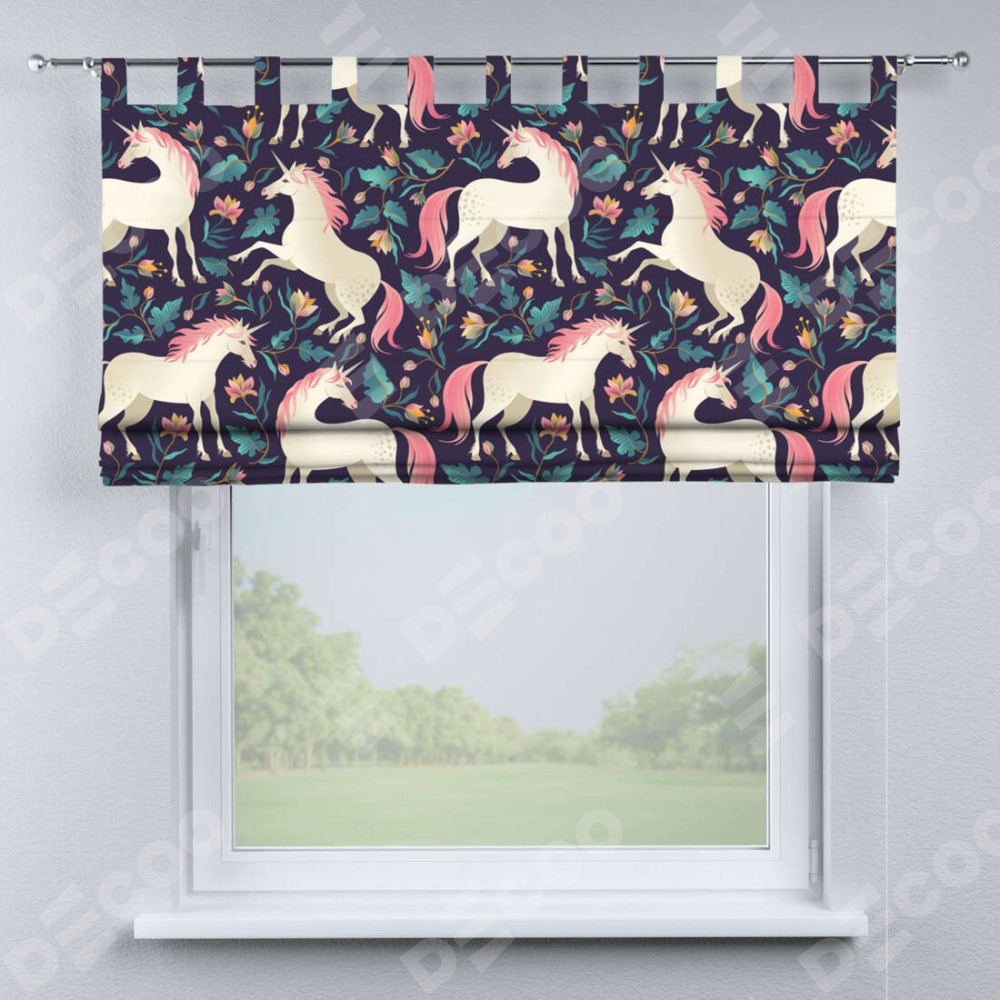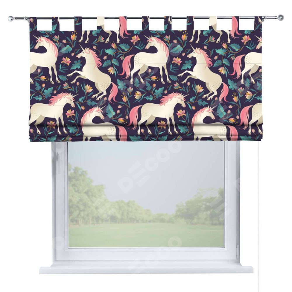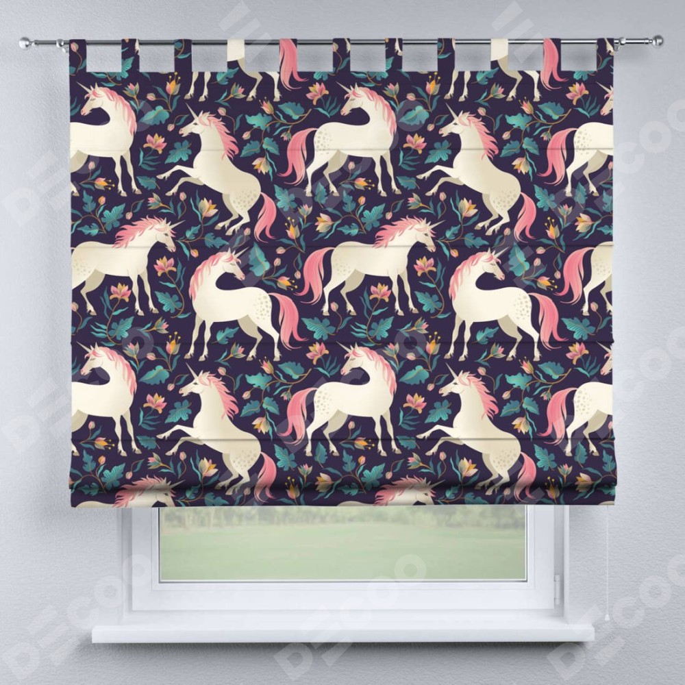 Римская штора производителя «Cortin», используется для проёма, пошита из ткани блэкаут с нанесением сублимационной печати «Сказочные единороги». Данная модель пошита на петлях, комплектуется на выбор круглым карнизом и подходит для монтажа на стену. Римская штора на петлях имеет простую систему регулировки высоты, отличительным преимуществом данной модели является простой способ монтажа. Достаточно повесить ее на трубу и штора готова!