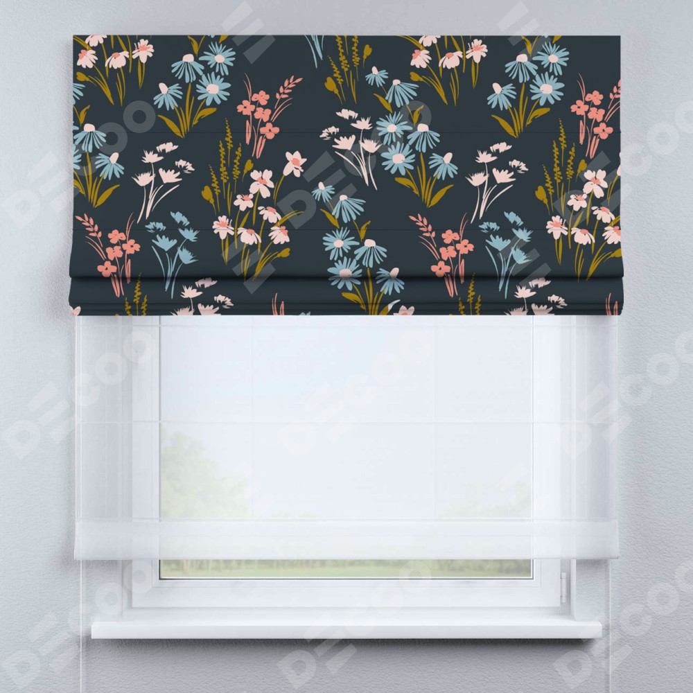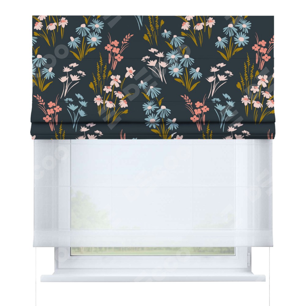 Римская штора день-ночь производителя «Cortin», используется для проёма, пошита из двух полотен, с лицевой блэкаут с нанесением сублимационной печати «Чарующие цветы», вторая ткань тюль (по стандарту комплектуется тюль белого цвета артикул V-01). Имеет универсальный механизм и подходит для монтажа: на потолок, на стену и в нишу.