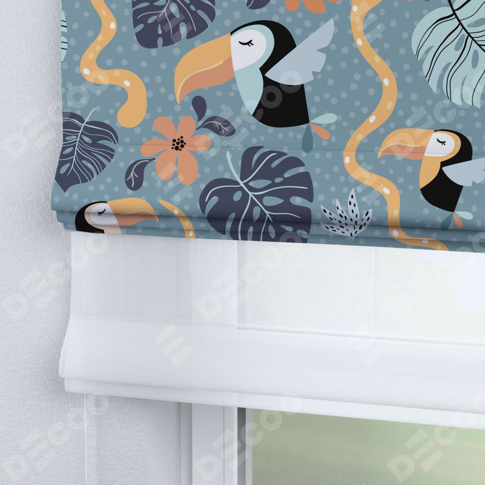 Римская штора день-ночь производителя «Cortin», используется для проёма, пошита из двух полотен, с лицевой блэкаут с нанесением сублимационной печати «Экзотические птицы», вторая ткань тюль (по стандарту комплектуется тюль белого цвета артикул V-01). Имеет универсальный механизм и подходит для монтажа: на потолок, на стену и в нишу.