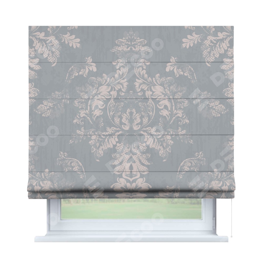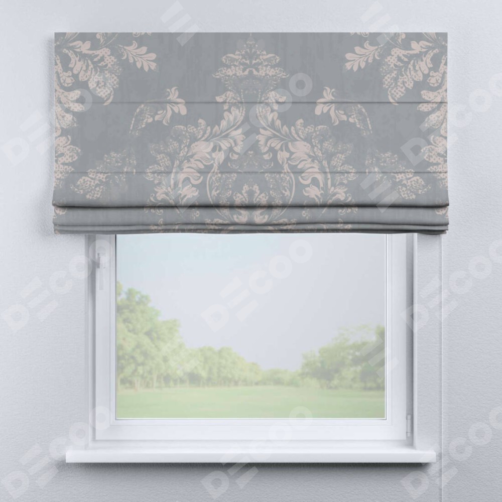 Римская штора производителя «Cortin», используется для проёма, пошита из ткани блэкаут с нанесением сублимационной печати «Винтажный узор серый». Имеет универсальный механизм и подходит для монтажа: на потолок, на стену и в нишу.