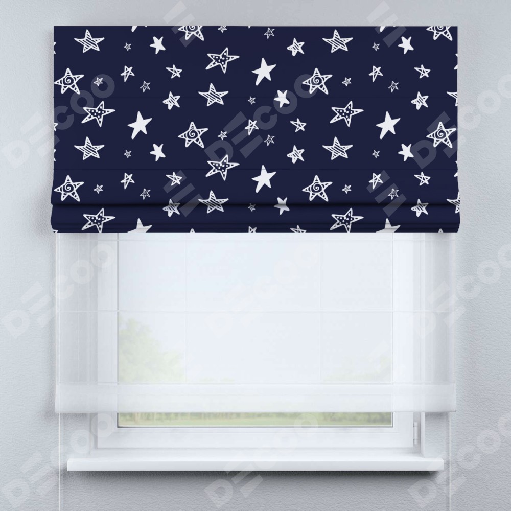 Римская штора день-ночь производителя «Cortin», используется для проёма, пошита из двух полотен, с лицевой блэкаут с нанесением сублимационной печати «Ночные звёзды», вторая ткань тюль (по стандарту комплектуется тюль белого цвета артикул V-01). Имеет универсальный механизм и подходит для монтажа: на потолок, на стену и в нишу.