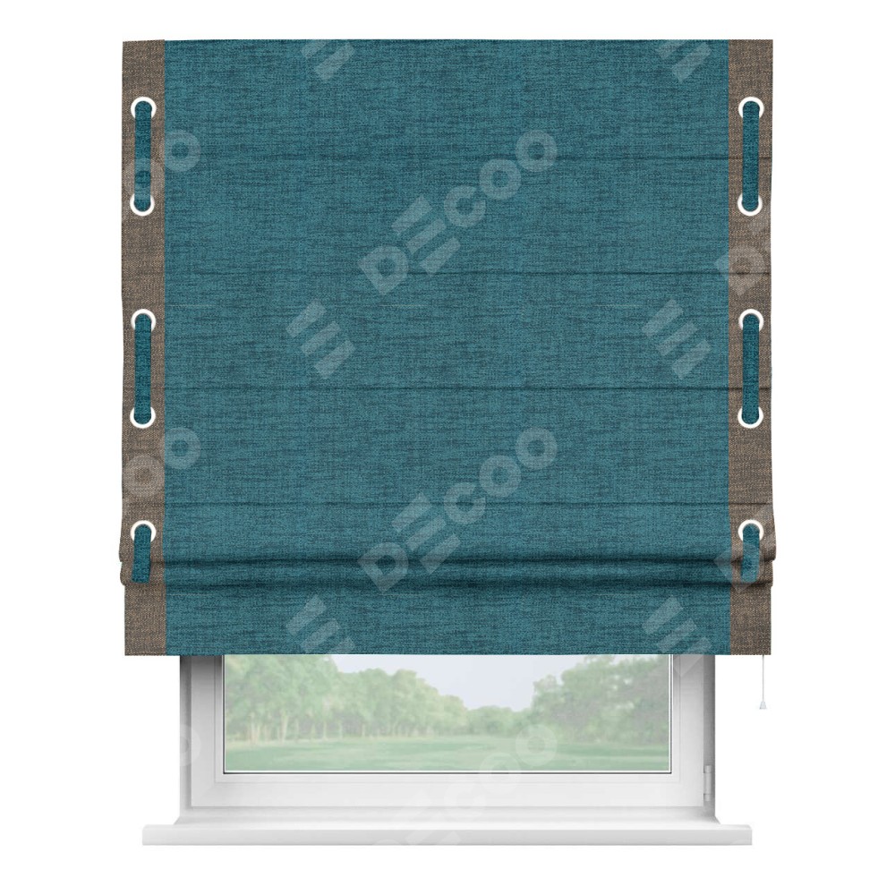 Римская штора производителя «Cortin», используется для проёма, пошита из ткани рогожка димаут синий, артикул 80422. Отделка шторы кантом «Стрим Дуо» на кантах расположены люверсы с пояском, ткань для канта используется из рогожки разной расцветки на выбор. Ткань для пояска обычно используется из основной ткани шторы, а так же можно сделать из любой расцветки по желанию. Имеет универсальный механизм и подходит для монтажа: на потолок, на стену и в нишу.