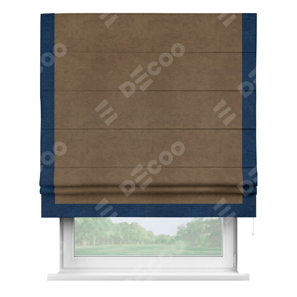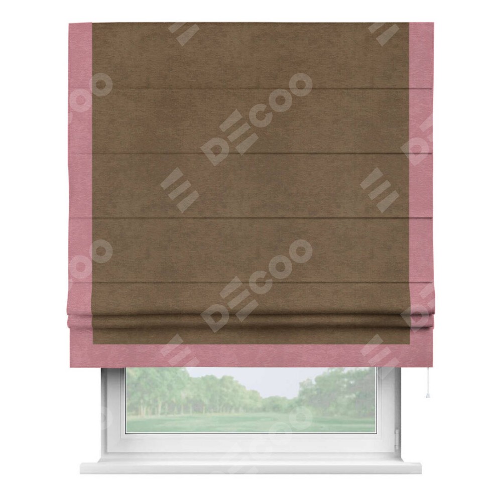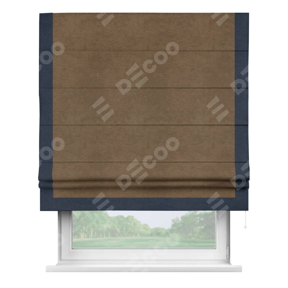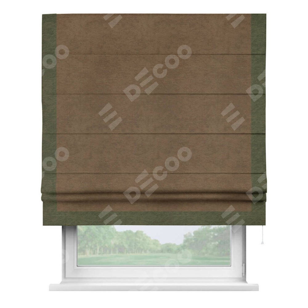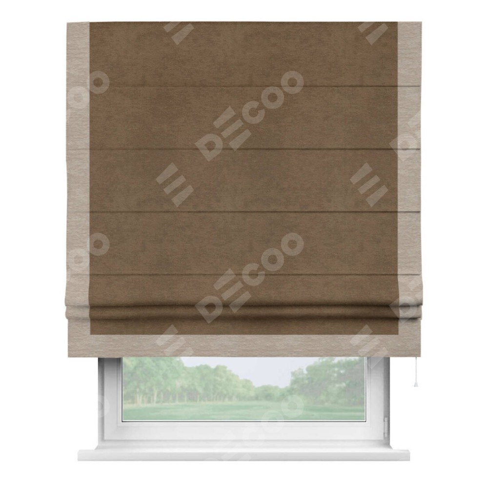 Римская штора производителя «Cortin», используется для проёма, пошита из ткани софт однотонный бронзовый, артикул 33099. Отделка шторы кантом «Виктория», ткань для канта используется из софта разной расцветки на выбор. Имеет универсальный механизм и подходит для монтажа: на потолок, на стену и в нишу.
