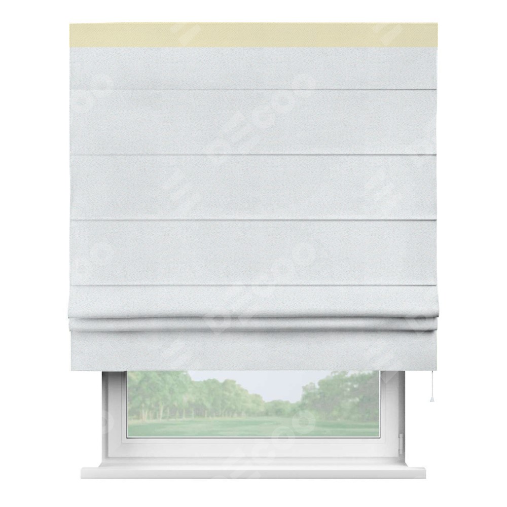 Римская штора производителя «Cortin», используется для проёма, пошита из ткани блэкаут однотонный дымчато-белый, артикул ткани 101. Отделка шторы кантом «Кинг», ткань для канта используется из блэкаута однотонного разной расцветки на выбор. Имеет универсальный механизм и подходит для монтажа: на потолок, на стену и в нишу.